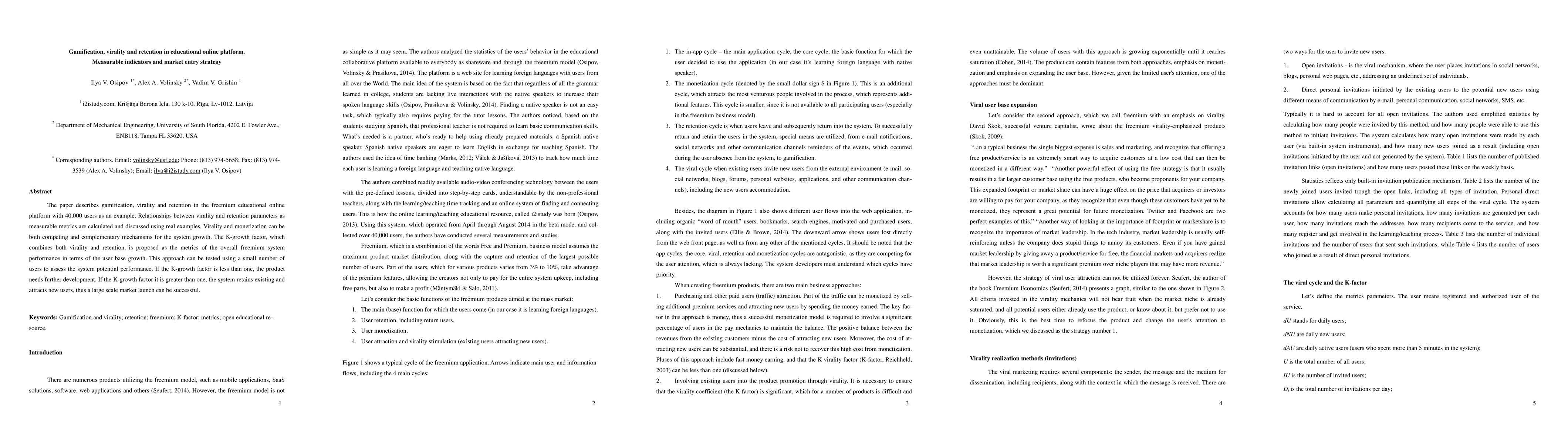 The paper describes gamification, virality and retention in the freemium educational online platform with 40,000 users as an example. Relationships between virality and retention parameters as measurable metrics are calculated and discussed using real examples. Virality and monetization can be both competing and complementary mechanisms for the system growth. The K-growth factor, which combines both virality and retention, is proposed as the metrics of the overall freemium system performance in terms of the user base growth. This approach can be tested using a small number of users to assess the system potential performance. If the K-growth factor is less than one, the product needs further development. If the K-growth factor it is greater than one, the system retains existing and attracts new users, thus a large scale market launch can be successful.