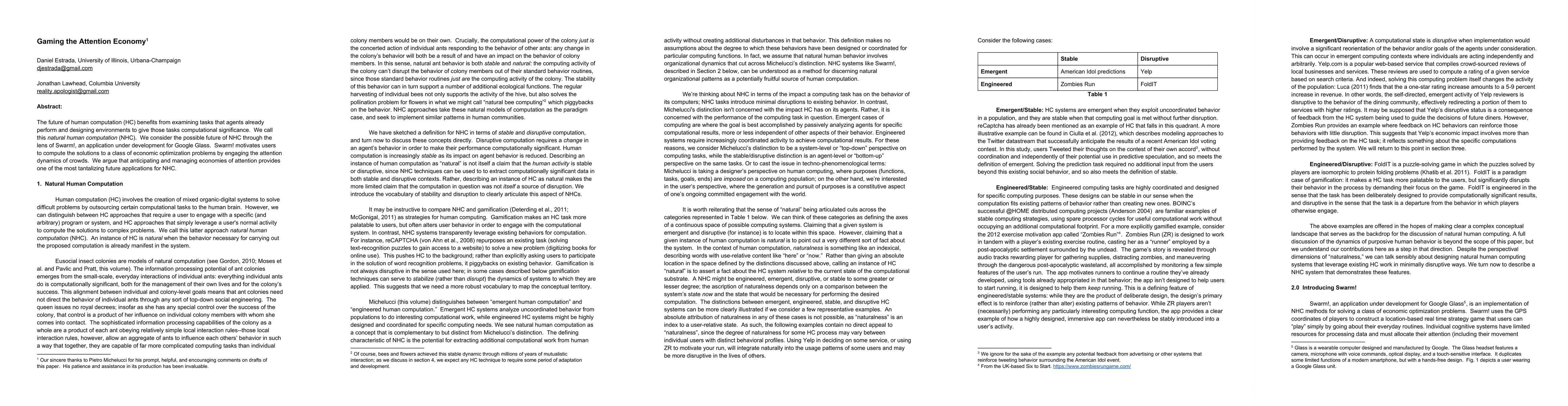 The future of human computation (HC) benefits from examining tasks that agents already perform and designing environments to give those tasks computational significance. We call this natural human computation (NHC). We consider the possible future of NHC through the lens of Swarm!, an application under development for Google Glass. Swarm! motivates users to compute the solutions to a class of economic optimization problems by engaging the attention dynamics of crowds. We argue that anticipating and managing economies of attention provides one of the most tantalizing future applications for NHC.