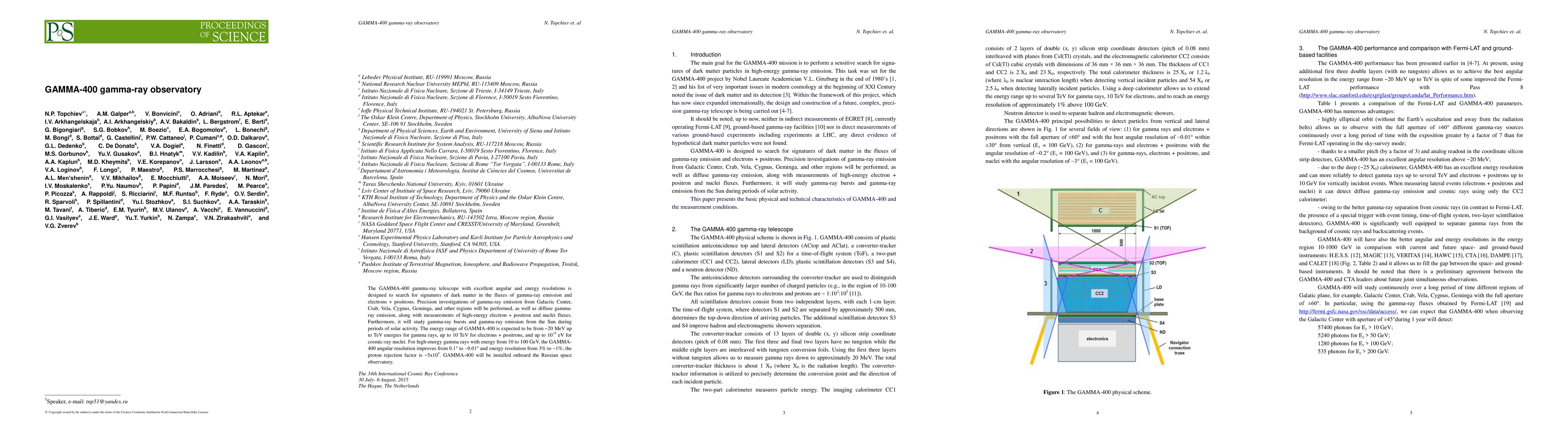 The GAMMA-400 gamma-ray telescope with excellent angular and energy resolutions is designed to search for signatures of dark matter in the fluxes of gamma-ray emission and electrons + positrons. Precision investigations of gamma-ray emission from Galactic Center, Crab, Vela, Cygnus, Geminga, and other regions will be performed, as well as diffuse gamma-ray emission, along with measurements of high-energy electron + positron and nuclei fluxes. Furthermore, it will study gamma-ray bursts and gamma-ray emission from the Sun during periods of solar activity. The energy range of GAMMA-400 is expected to be from ~20 MeV up to TeV energies for gamma rays, up to 20 TeV for electrons + positrons, and up to 10E15 eV for cosmic-ray nuclei. For high-energy gamma rays with energy from 10 to 100 GeV, the GAMMA-400 angular resolution improves from 0.1{\deg} to ~0.01{\deg} and energy resolution from 3% to ~1%; the proton rejection factor is ~5x10E5. GAMMA-400 will be installed onboard the Russian space observatory.