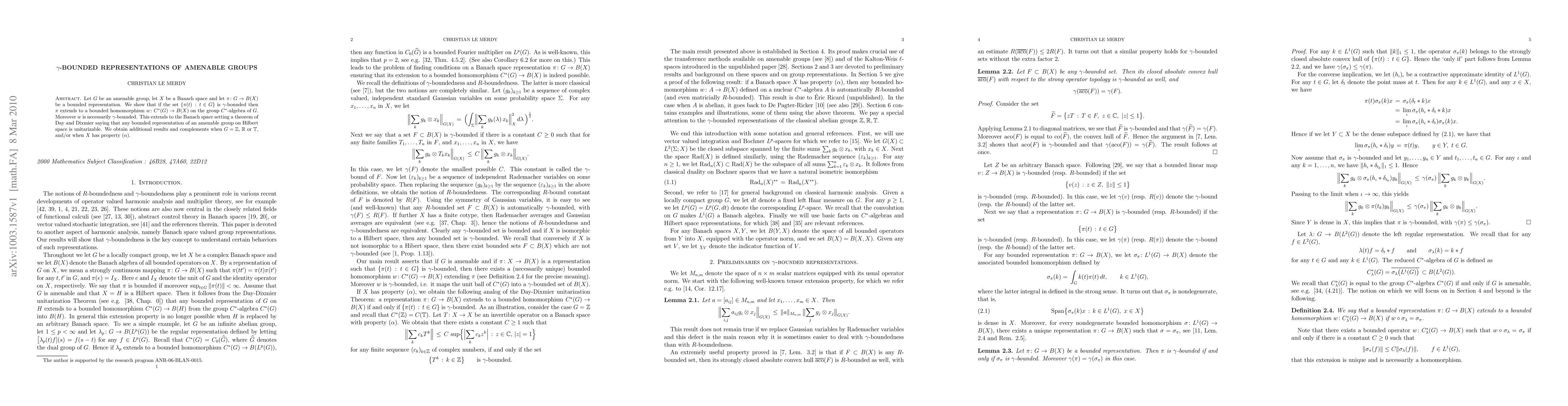 Let G be an amenable group, let X be a Banach space and let \pi : G --> B(X) be a bounded representation. We show that if the set {\pi(t) : t \in G} is gamma-bounded then \pi extends to a bounded homomorphism w : C*(G) --> B(X) on the group C*-algebra of G. Moreover w is necessarily gamma-bounded. This extends to the Banach space setting a theorem of Day and Dixmier saying that any bounded representation of an amenable group on Hilbert space is unitarizable. We obtain additional results and complements when G is equal to either the real numbers, the integers or the unit circle, and/or when X has property (\alpha).