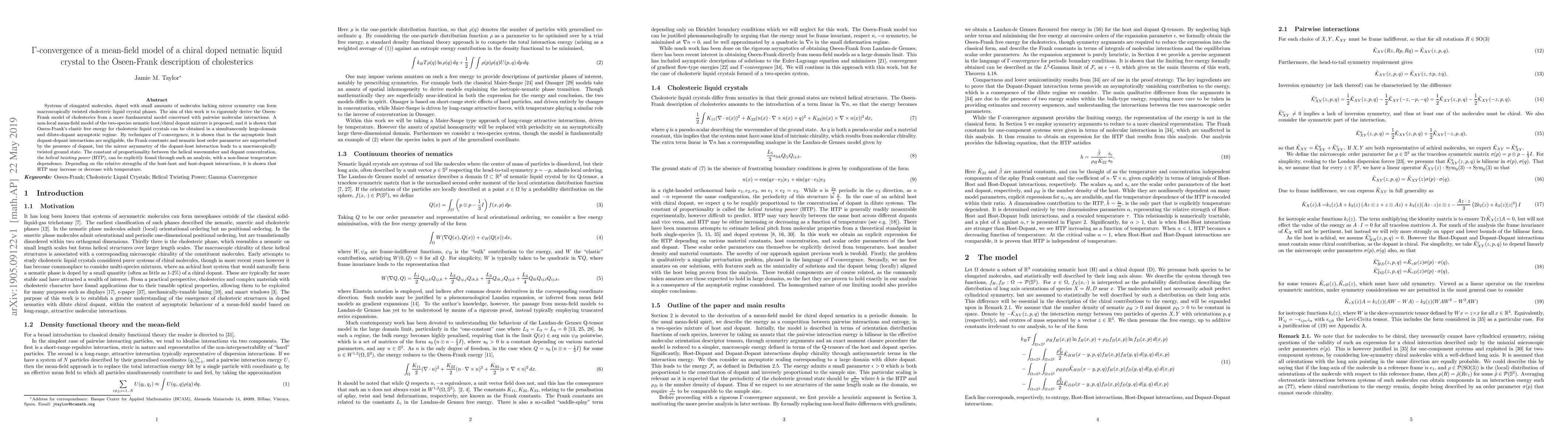 Systems of elongated molecules, doped with small amounts of molecules lacking mirror symmetry can form macroscopically twisted cholesteric liquid crystal phases. The aim of this work is to rigorously derive the Oseen-Frank model of cholesterics from a more fundamental model concerned with pairwise molecular interactions. A non-local mean-field model of the two-species nematic host/chiral dopant mixture is proposed, and it is shown that Oseen-Frank's elastic free energy for cholesteric liquid crystals can be obtained in a simultaneously large-domain and dilute-dopant asymptotic regime. By techniques of $\Gamma$-convergence, it is shown that in the asymptotic limit dopant-dopant interactions are negligable, the Frank constants and nematic host order parameter are unperturbed by the presence of dopant, but the mirror asymmetry of the dopant-host interaction leads to a macroscopically twisted ground state. The constant of proportionality between the helical wavenumber and dopant concentration, the {\it helical twisting power} (HTP), can be explicitly found through such an analysis, with a non-linear temperature dependence. Depending on the relative strengths of the host-host and host-dopant interactions, it is shown that HTP may increase or decrease with temperature.