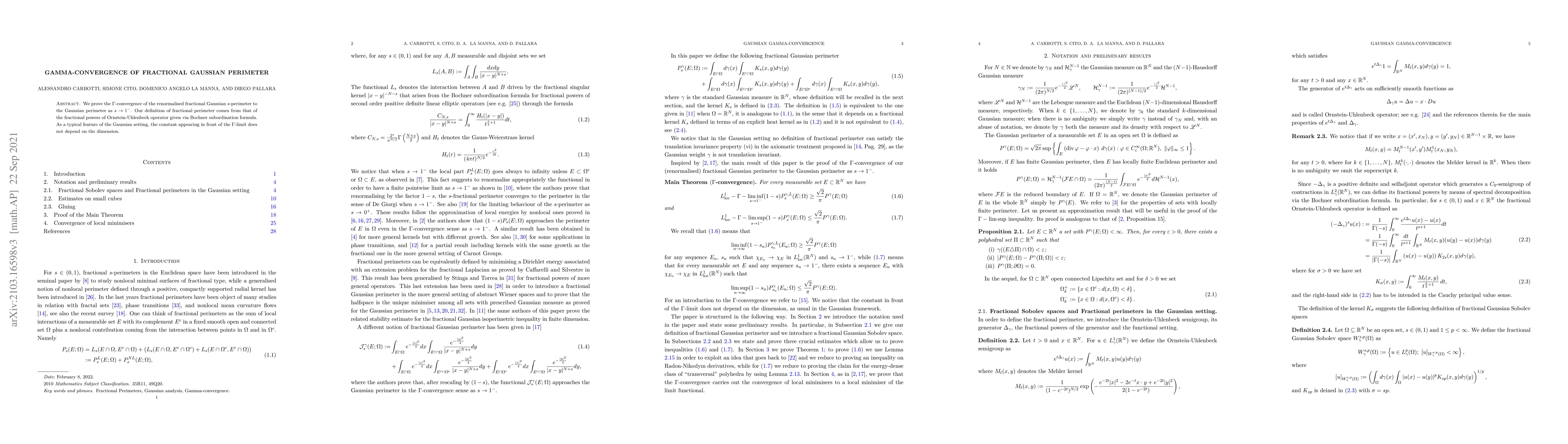 This paper proves the $\Gamma$-convergence of the renormalised fractional Gaussian $s$-perimeter to the Gaussian perimeter as $s$ approaches $1$ from below. The fractional perimeter is defined through the fractional powers of the Ornstein-Uhlenbeck operator, and notably, the constant in the $\Gamma$-limit is independent of the dimension.