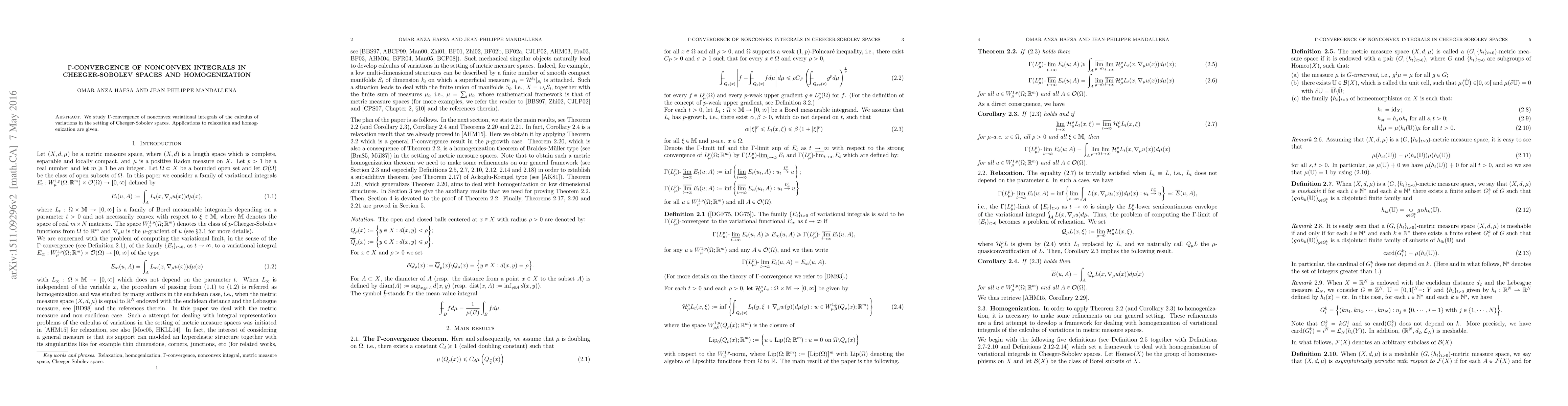 Summary: This paper investigates the {\Gamma}-convergence of nonconvex variational integrals within Cheeger-Sobolev spaces, providing applications to the relaxation and homogenization processes.