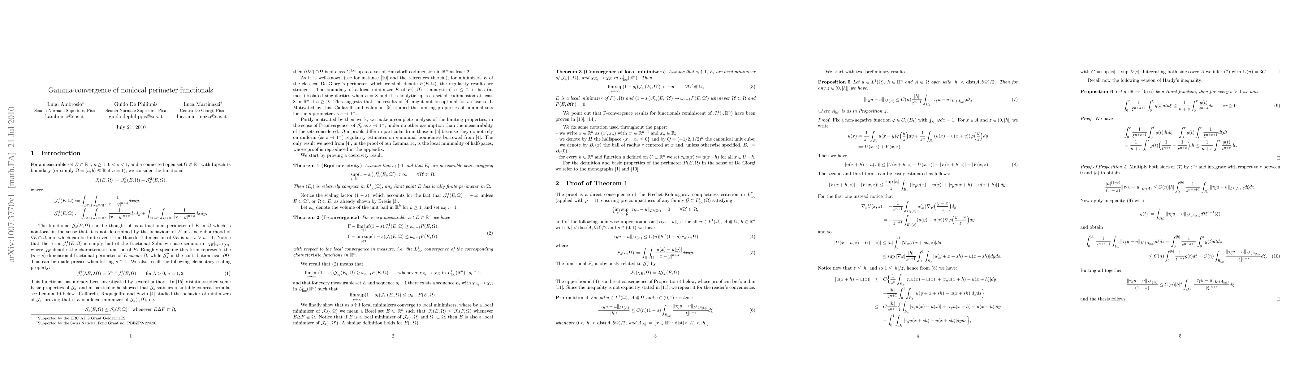 Summary: This paper demonstrates the Gamma-convergence of specific nonlocal functionals to the classical perimeter functional in the De Giorgi sense, establishing a connection between nonlocal and local geometric measures.
