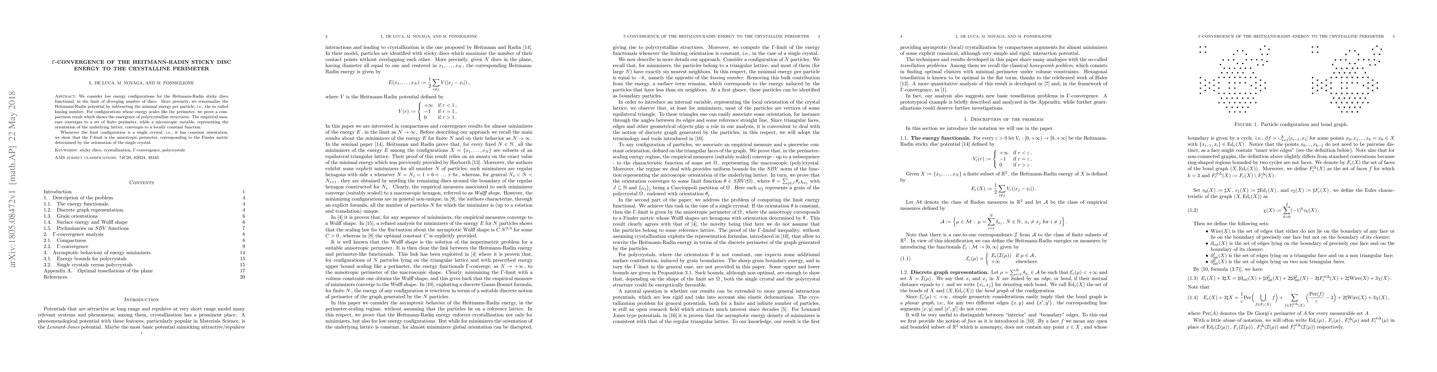 We consider low energy configurations for the Heitmann-Radin sticky discs functional, in the limit of diverging number of discs. More precisely, we renormalize the Heitmann-Radin potential by subtracting the minimal energy per particle, i.e., the so called kissing number. For configurations whose energy scales like the perimeter, we prove a compactness result which shows the emergence of polycrystalline structures: The empirical measure converges to a set of finite perimeter, while a microscopic variable, representing the orientation of the underlying lattice, converges to a locally constant function. Whenever the limit configuration is a single crystal, i.e., it has constant orientation, we show that the $\Gamma$-limit is the anisotropic perimeter, corresponding to the Finsler metric determined by the orientation of the single crystal.