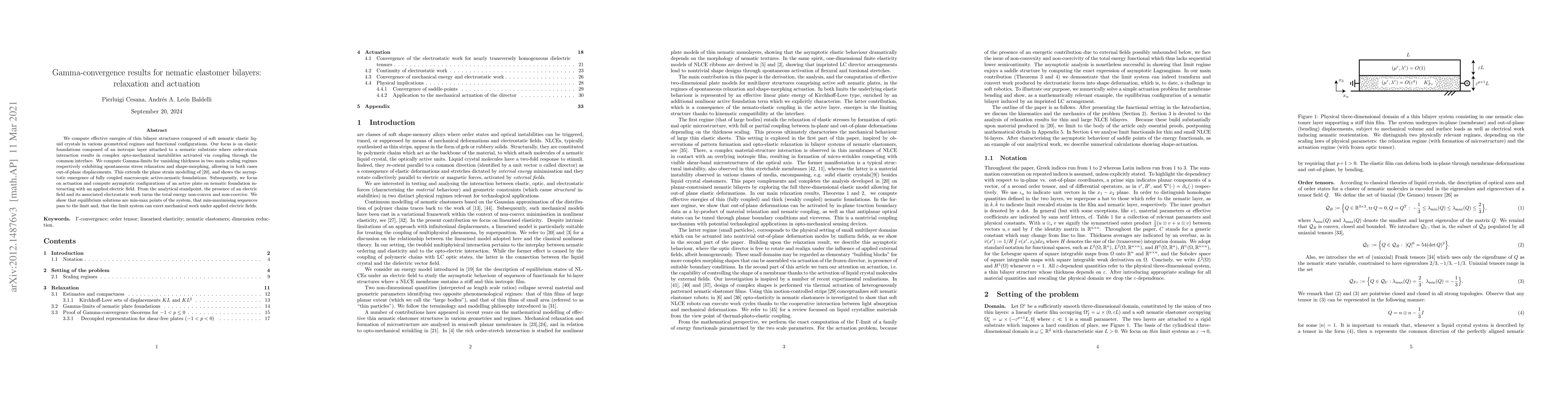 This paper investigates the effective energies of thin bilayer structures made of nematic elastomers, focusing on the order-strain interaction in elastic foundations. It computes Gamma-limits to analyze spontaneous stress relaxation and shape-morphing, extending plane strain models. The study also examines actuation effects under applied electric fields, showing that equilibrium solutions are min-max points and the system can perform mechanical work.