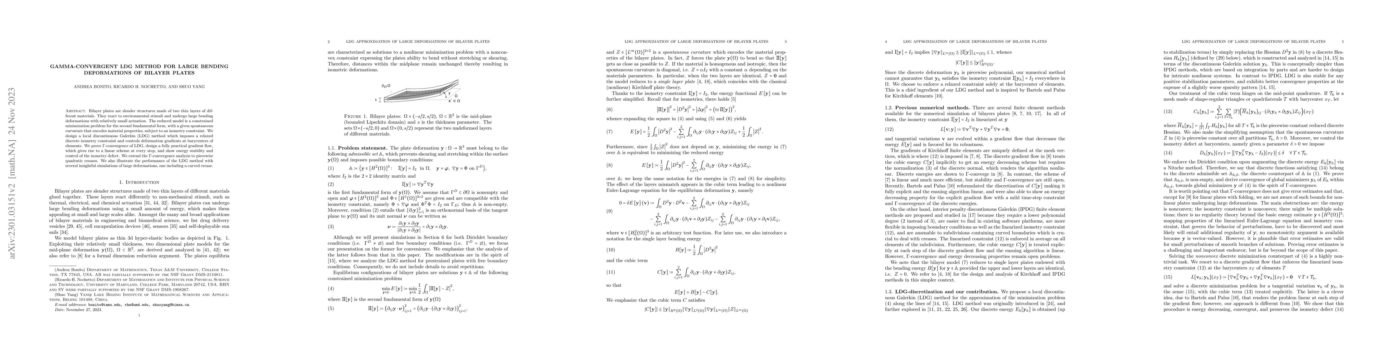 This paper proposes a $\Gamma$-convergent local discontinuous Galerkin (LDG) method for modeling large bending deformations in bilayer plates, ensuring stability and control of isometry defects. The method is demonstrated through simulations showcasing its practical effectiveness.