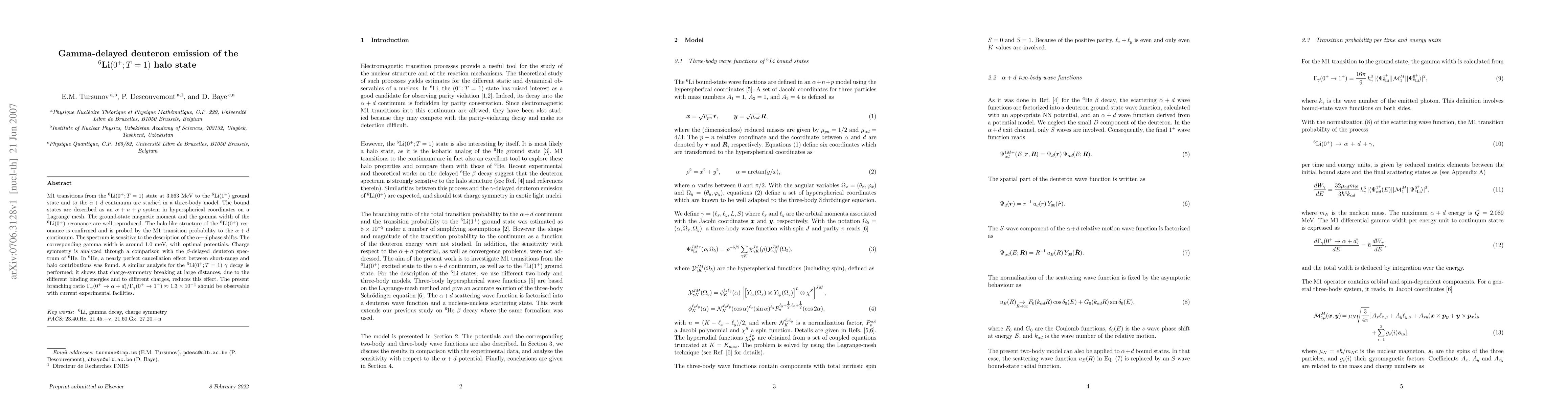 M1 transitions from the $^6$Li($0^+;T=1$) state at 3.563 MeV to the $^6$Li($1^+$) ground state and to the $\alpha+d$ continuum are studied in a three-body model. The bound states are described as an $\alpha+n+p$ system in hyperspherical coordinates on a Lagrange mesh. The ground-state magnetic moment and the gamma width of the $^6$Li(0$^+$) resonance are well reproduced. The halo-like structure of the $^6$Li$(0^+)$ resonance is confirmed and is probed by the M1 transition probability to the $\alpha+d$ continuum. The spectrum is sensitive to the description of the $\alpha+d$ phase shifts. The corresponding gamma width is around 1.0 meV, with optimal potentials. Charge symmetry is analyzed through a comparison with the $\beta$-delayed deuteron spectrum of $^6$He. In $^6$He, a nearly perfect cancellation effect between short-range and halo contributions was found. A similar analysis for the $^6$Li($0^+;T=1$) $\gamma$ decay is performed; it shows that charge-symmetry breaking at large distances, due to the different binding energies and to different charges, reduces this effect. The present branching ratio $\Gamma_{\gamma}(0^+\to \alpha+d)/\Gamma_{\gamma}(0^+\to1^+)\approx 1.3\times 10^{-4}$ should be observable with current experimental facilities.