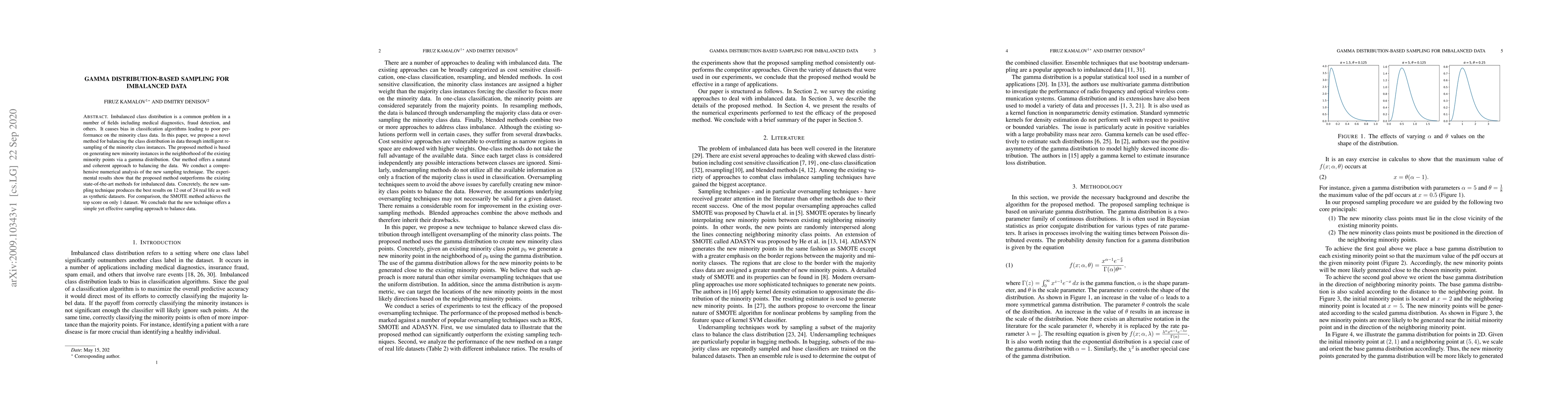 This paper proposes a gamma distribution-based resampling method to balance imbalanced datasets, generating new minority instances near existing ones. Experimental results show it outperforms existing methods, achieving top performance on 12 out of 24 datasets compared to just 1 for SMOTE.