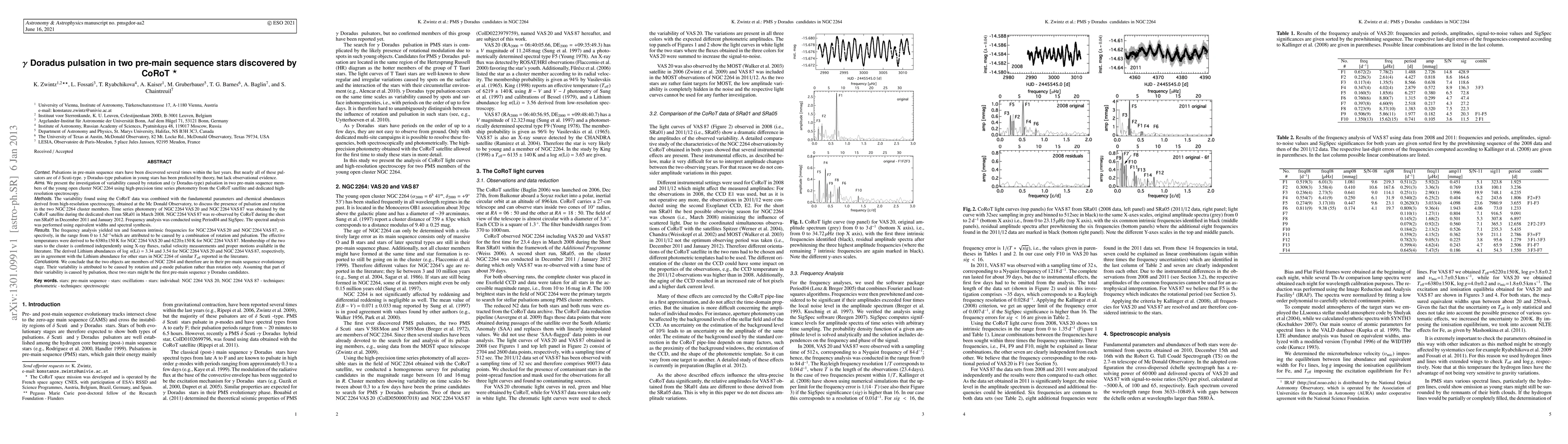 Pulsations in pre-main sequence stars have been discovered several times within the last years. But nearly all of these pulsators are of delta Scuti-type. gamma Doradus-type pulsation in young stars has been predicted by theory, but lack observational evidence. We present the investigation of variability caused by rotation and (gammaDoradus-type) pulsation in two pre-main sequence members of the young open cluster NGC2264 using high-precision time series photometry from the CoRoT satellite and dedicated high-resolution spectroscopy. Time series photometry of NGC2264VAS20 and NGC 2264VAS87 was obtained by the CoRoT satellite during the dedicated short run SRa01 in March 2008. NGC2264VAS87 was re-observed by CoRoT during the short run SRa05 in December 2011 and January 2012. Frequency analysis was conducted using Period04 and SigSpec. The spectral analysis was performed using equivalent widths and spectral synthesis. The frequency analysis yielded 10 and 14 intrinsic frequencies for NGC2264VAS20 and NGC2264VAS 87, respectively, in the range from 0 to 1.5c/d which are attributed to be caused by a combination of rotation and pulsation. The effective temperatures were derived to be 6380$\pm$150K for NGC2264VAS20 and 6220$\pm$150K for NGC2264VAS87. Membership of the two stars to the cluster is confirmed independently using X-ray fluxes, radial velocity measurements and proper motions available in the literature. The derived Li abundances of log n(Li)=3.34 and 3.54 for NGC2264VAS20 and NGC2264VAS87, respectively, are in agreement with the Li abundance for other stars in NGC2264 of similar Teff reported in the literature. We conclude that the two objects are members of NGC2264 and therefore are in their pre-main sequence evolutionary stage. Assuming that part of their variability is caused by pulsation, these two stars might be the first pre-main sequence gamma Doradus candidates.
