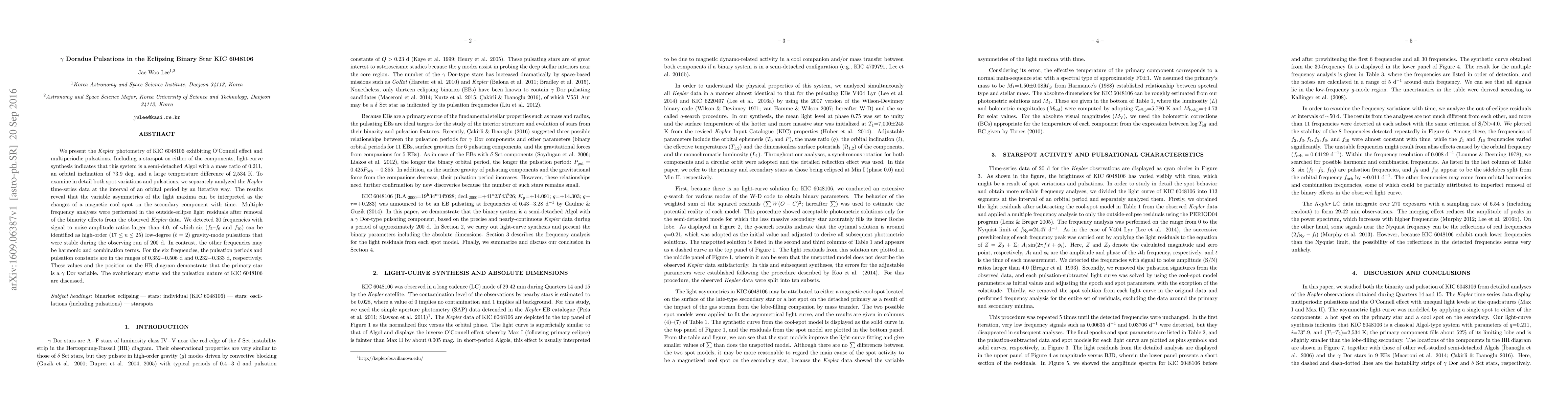 This paper analyzes $\gamma$ Doradus pulsations in the eclipsing binary star KIC 6048106 using Kepler photometry, identifying it as a semi-detached Algol system. The study detected 30 pulsation frequencies, six of which are high-order gravity-mode pulsations, confirming the primary star as a $\gamma$ Dor variable.