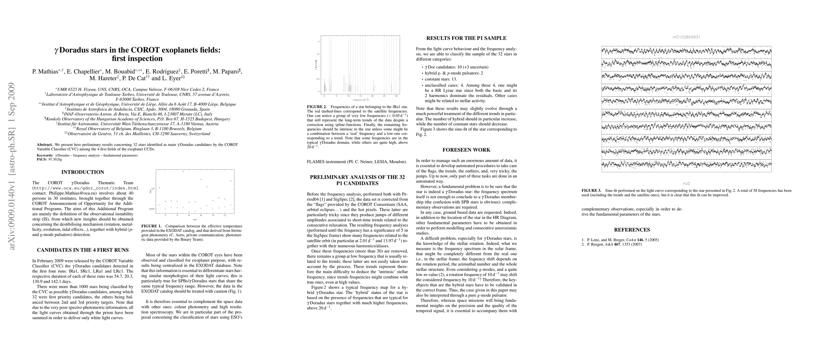 We present here preliminary results concerning 32 stars identified as main gamma Doradus candidates by the COROT Variable Classifier (CVC) among the 4 first fields of the exoplanet CCDs.