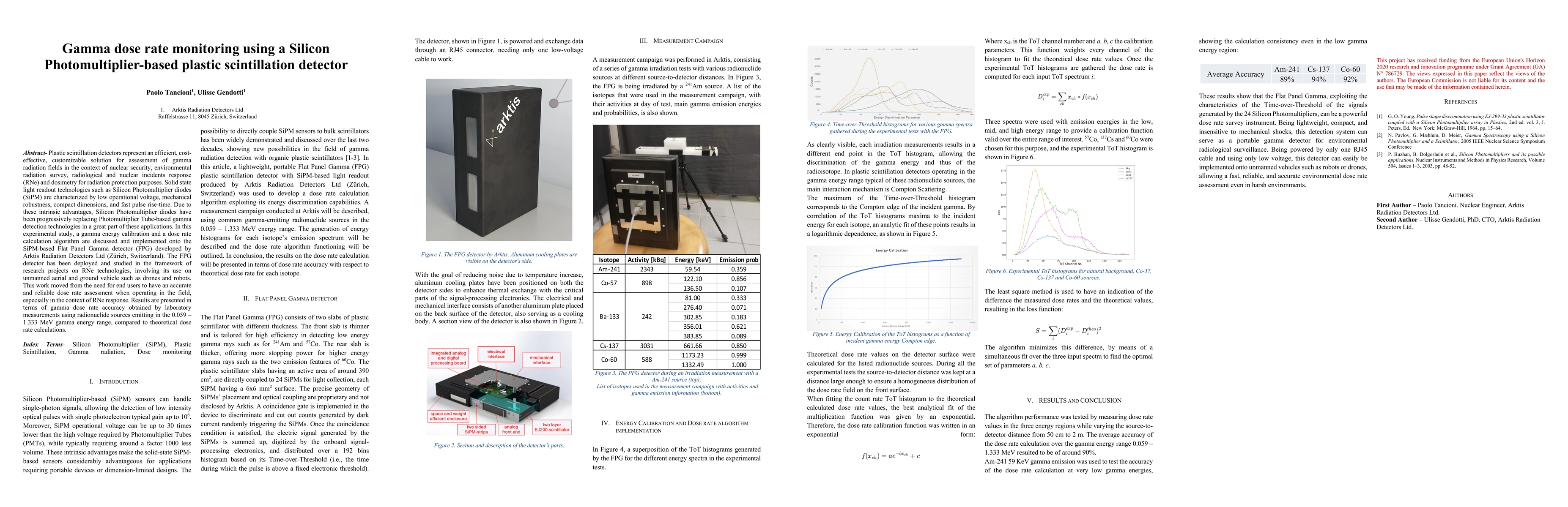Plastic scintillation detectors represent an efficient, cost-effective, customizable solution for assessment of gamma radiation fields in the context of nuclear security, environmental radiation survey, radiological and nuclear incidents response (RNe) and dosimetry for radiation protection purposes. Solid state light readout technologies such as Silicon Photomultiplier diodes (SiPM) are characterized by low operational voltage, mechanical robustness, compact dimensions, and fast pulse rise-time. Due to these intrinsic advantages, Silicon Photomultiplier diodes have been progressively replacing Photomultiplier Tube-based gamma detection technologies in a great part of these applications. In this experimental study, a gamma energy calibration and a dose rate calculation algorithm are discussed and implemented onto the SiPM-based Flat Panel Gamma detector (FPG) developed by Arktis Radiation Detectors Ltd (Zurich, Switzerland). The FPG detector has been deployed and studied in the framework of research projects on RNe technologies, involving its use on unmanned aerial and ground vehicle such as drones and robots. This work moved from the need for end users to have an accurate and reliable dose rate assessment when operating in the field, especially in the context of RNe response. Results are presented in terms of gamma dose rate accuracy obtained by laboratory measurements using radionuclide sources emitting in the 0.059 - 1.333 MeV gamma energy range, compared to theoretical dose rate calculations.