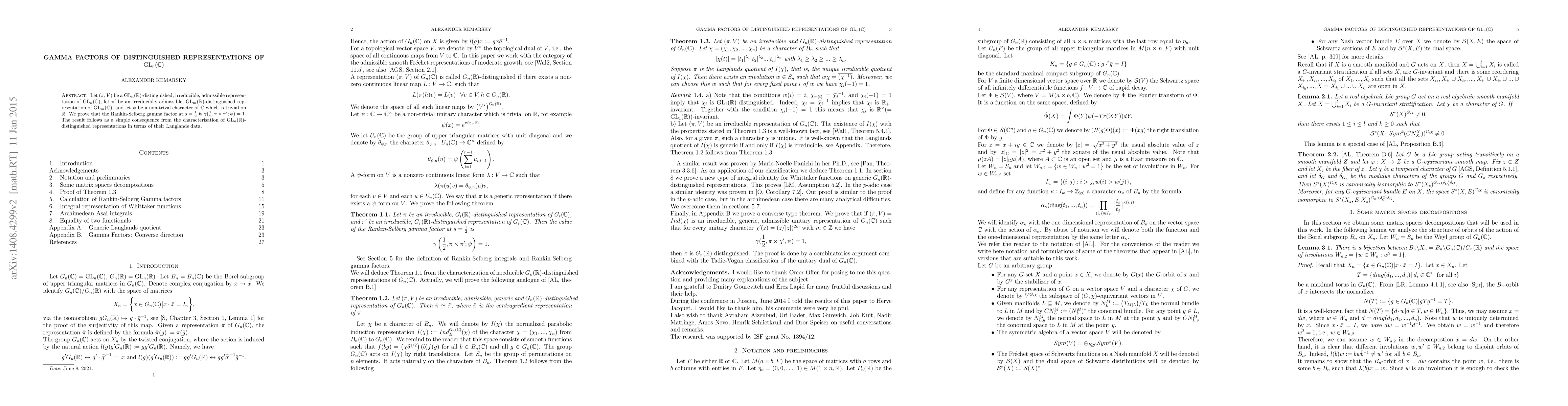 This paper proves that the Rankin-Selberg gamma factor for a pair of distinguished irreducible admissible representations of $GL_n(\mathbb{C})$ and $GL_m(\mathbb{C})$ at $s=\frac{1}{2}$ is 1, based on the characterization of these representations via their Langlands data.