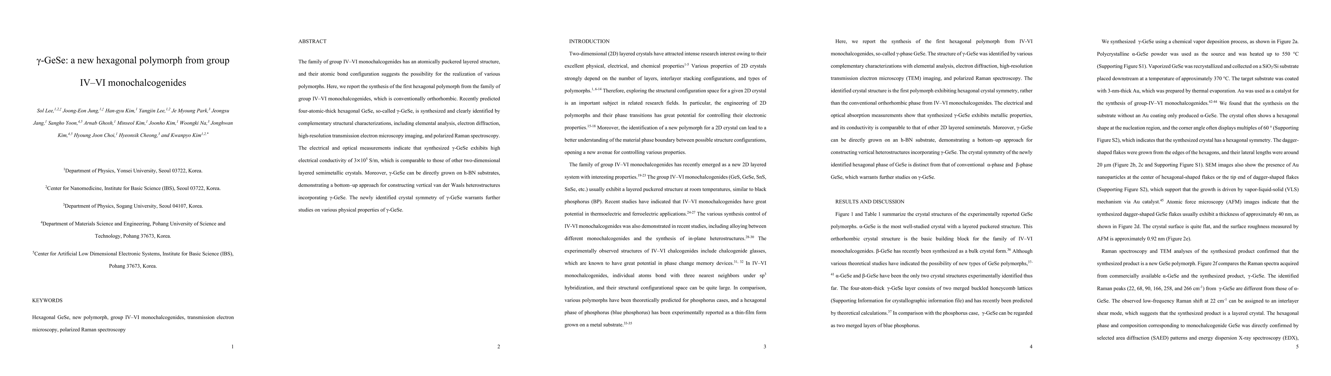 The research reports the synthesis and structural characterization of the first hexagonal polymorph, γ-GeSe, within the group IV-VI monochalcogenides family. The material exhibits high electrical conductivity and can be grown on h-BN substrates, indicating potential for van der Waals heterostructures.