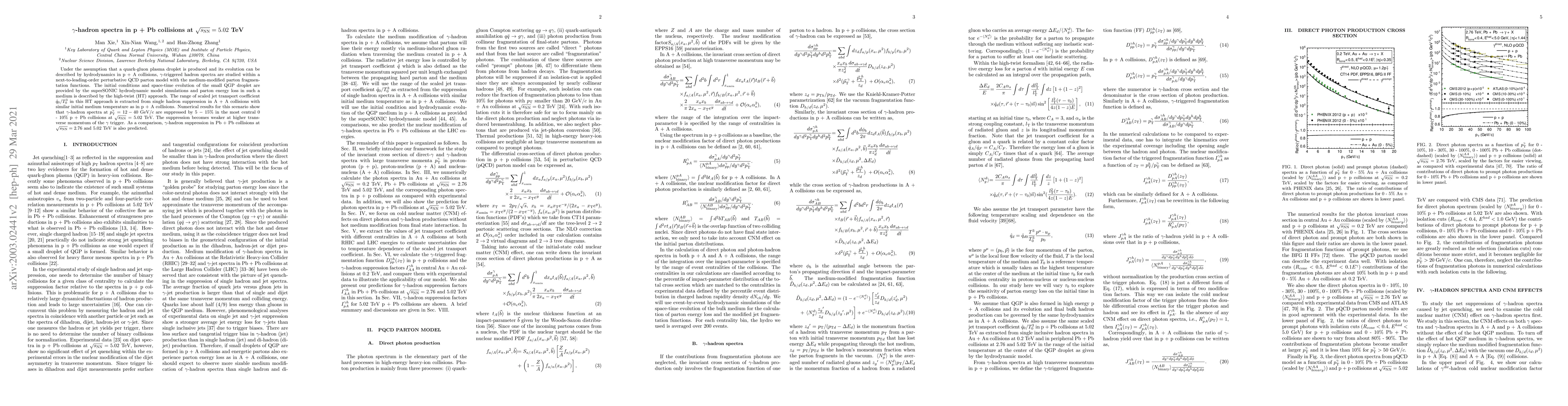 This paper investigates $\gamma$-hadron spectra in p + Pb collisions at $\sqrt{s_{\rm NN}}=5.02$ TeV, assuming a quark-gluon plasma droplet produced in the collision. The study uses a next-to-leading-order perturbative QCD model to analyze the spectra, showing a suppression of 5\% to 10\% for $\gamma$-hadrons at $p_{\rm T}^\gamma=12-40$ GeV/$c$ in the most central collisions.