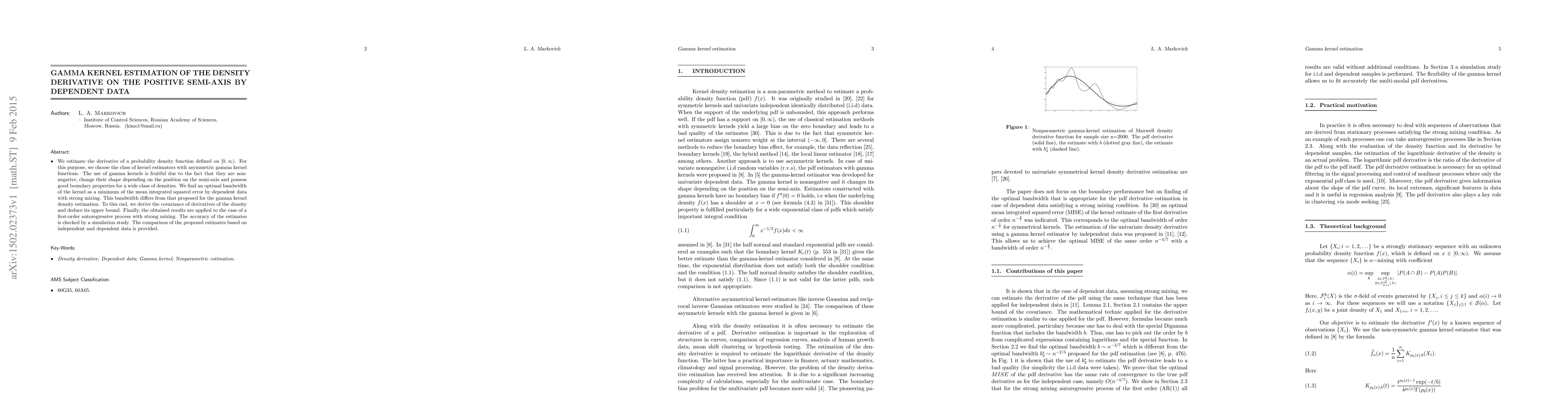 We estimate the derivative of a probability density function defined on $[0,\infty)$. For this purpose, we choose the class of kernel estimators with asymmetric gamma kernel functions. The use of gamma kernels is fruitful due to the fact that they are nonnegative, change their shape depending on the position on the semi-axis and possess good boundary properties for a wide class of densities. We find an optimal bandwidth of the kernel as a minimum of the mean integrated squared error by dependent data with strong mixing. This bandwidth differs from that proposed for the gamma kernel density estimation. To this end, we derive the covariance of derivatives of the density and deduce its upper bound. Finally, the obtained results are applied to the case of a first-order autoregressive process with strong mixing. The accuracy of the estimates is checked by a simulation study. The comparison of the proposed estimates based on independent and dependent data is provided.