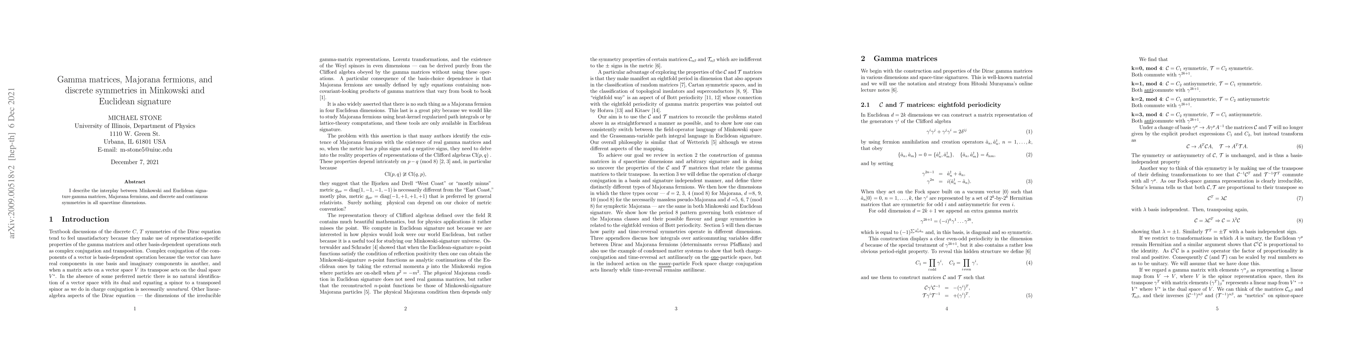 Summary: This paper explores the relationship between gamma matrices in Minkowski and Euclidean spacetimes, Majorana fermions, and the implications of discrete and continuous symmetries across all dimensions. It highlights the unique properties and transformations of these entities under different signature metrics.