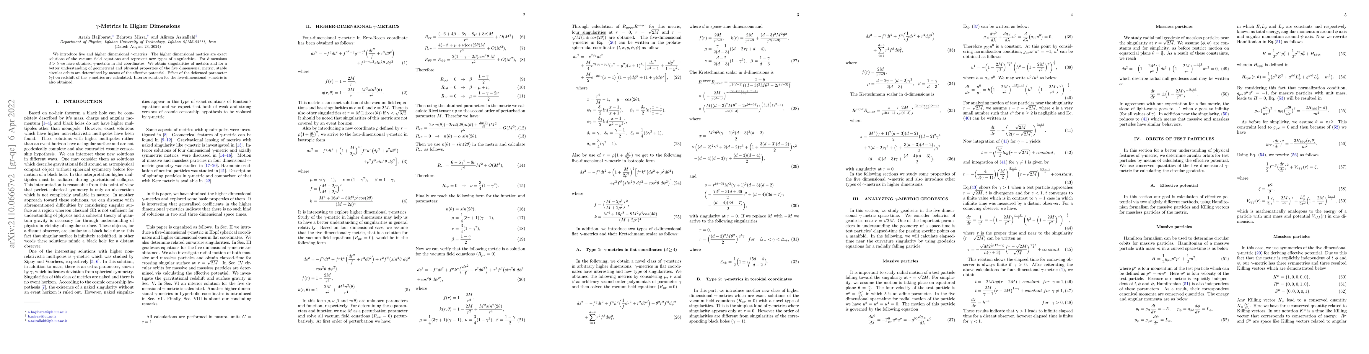 We introduce five and higher dimensional $\gamma$-metrics. The higher dimensional metrics are exact solutions of the vacuum field equations and represent new types of singularities. For dimensions $d>5$ we have obtained $\gamma$-metrics in flat coordinates. We obtain singularities of metrics and for a better understanding of geometrical and physical properties of the five dimensional metric, stable circular orbits are determined by means of the effective potential. Effect of the deformed parameter ($\gamma$) on redshift of the $\gamma$-metric are calculated. Interior solution for the five-dimensional $\gamma$-metric is also obtained.