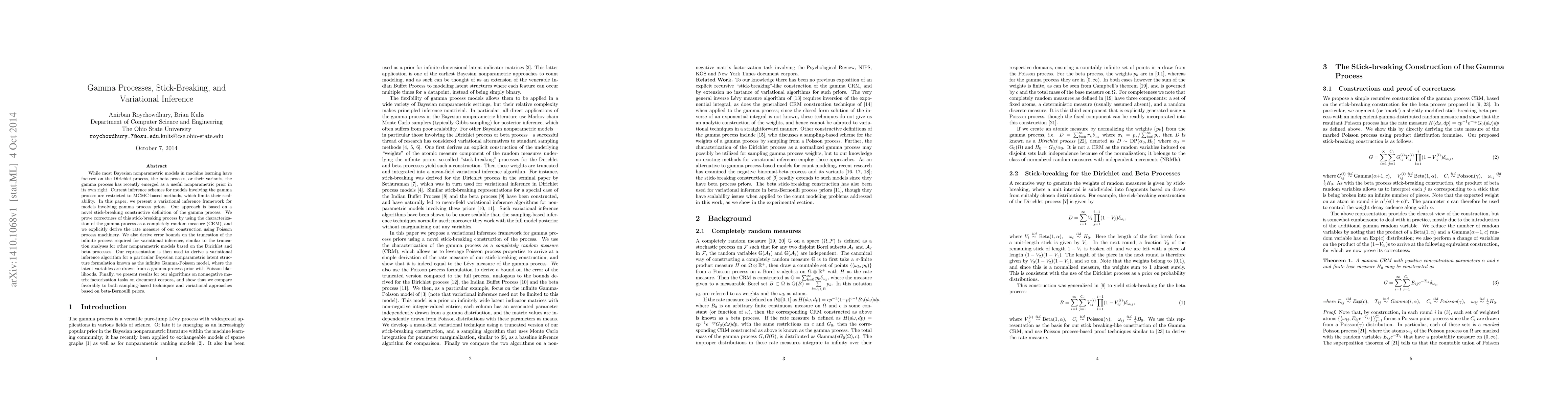This paper introduces a variational inference framework for models using gamma process priors, based on a novel stick-breaking construction. It demonstrates the effectiveness of the approach on nonnegative matrix factorization tasks, outperforming both MCMC-based and beta-Bernoulli variational methods.