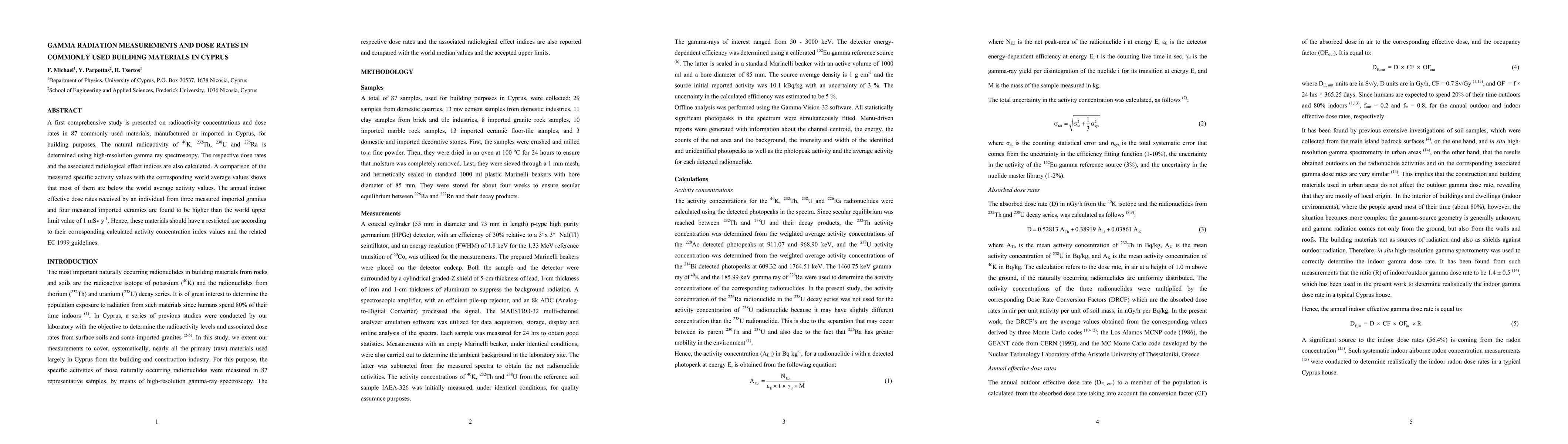 This study measures radioactivity in 87 building materials in Cyprus, finding most below world averages but some granites and ceramics exceed safe dose limits, suggesting restricted use.