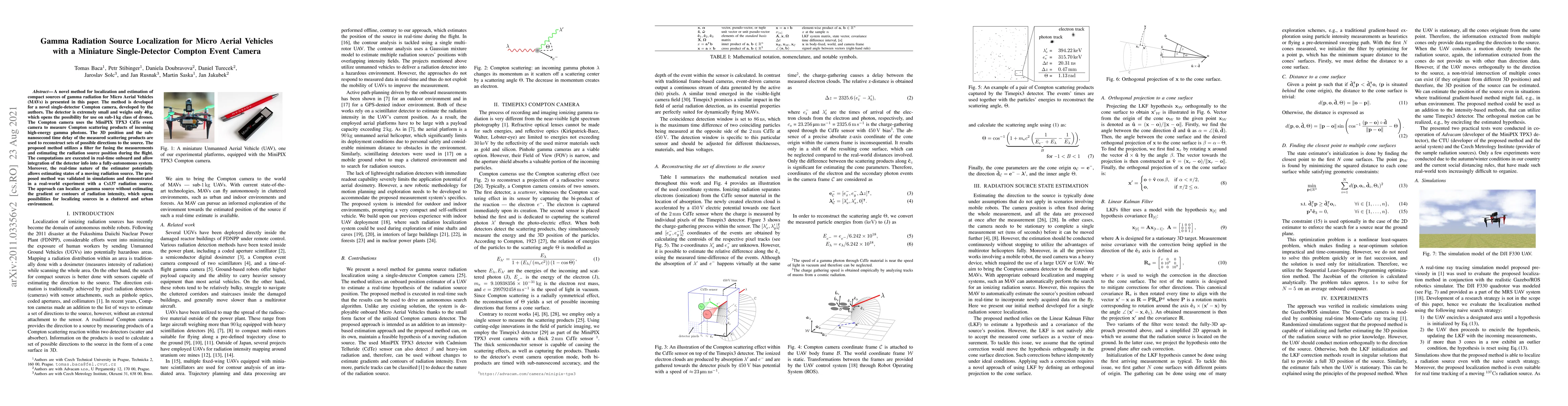 A novel method for localization and estimation of compact sources of gamma radiation for Micro Aerial Vehicles (MAVs) is presented in this paper. The method is developed for a novel single-detector Compton camera, developed by the authors. The detector is extremely small and weighs only 40 g, which opens the possibility for use on sub-1 kg class of drones. The Compton camera uses the MiniPIX TPX3 CdTe event camera to measure Compton scattering products of incoming high-energy gamma photons. The 3D position and the sub-nanosecond time delay of the measured scattering products are used to reconstruct sets of possible directions to the source. The proposed method utilizes a filter for fusing the measurements and estimating the radiation source position during the flight. The computations are executed in real-time onboard and allow integration of the detector info into a fully-autonomous system. Moreover, the real-time nature of the estimator potentially allows estimating states of a moving radiation source. The proposed method was validated in simulations and demonstrated in a real-world experiment with a Cs137 radiation source. The approach can localize a gamma source without estimating the gradient or contours of radiation intensity, which opens possibilities for localizing sources in a cluttered and urban environment.