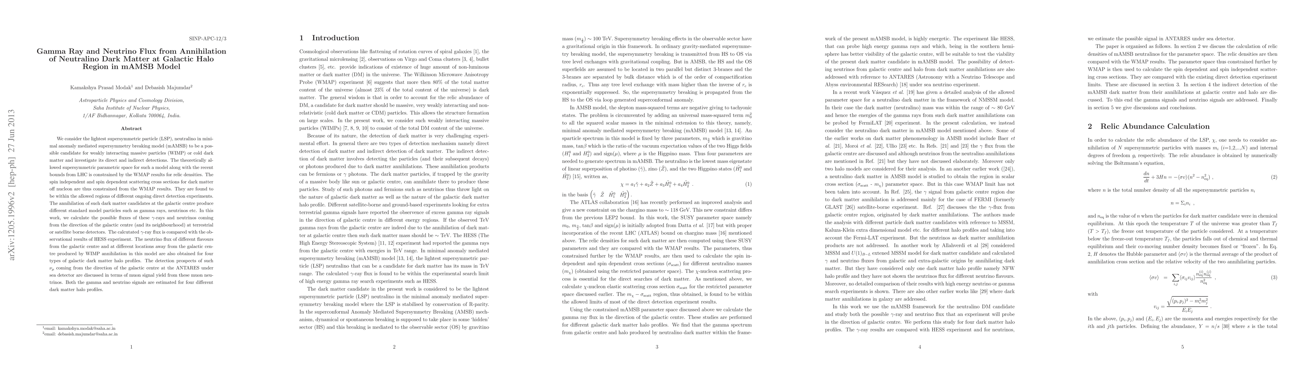 This paper investigates the gamma ray and neutrino fluxes from neutralino dark matter annihilation in the galactic halo under the mAMSB model, focusing on their detectability by terrestrial and satellite detectors. The study compares the calculated gamma-ray flux with HESS observations and evaluates the neutrino flux for different dark matter halo profiles, assessing the prospects for detection by the ANTARES detector.