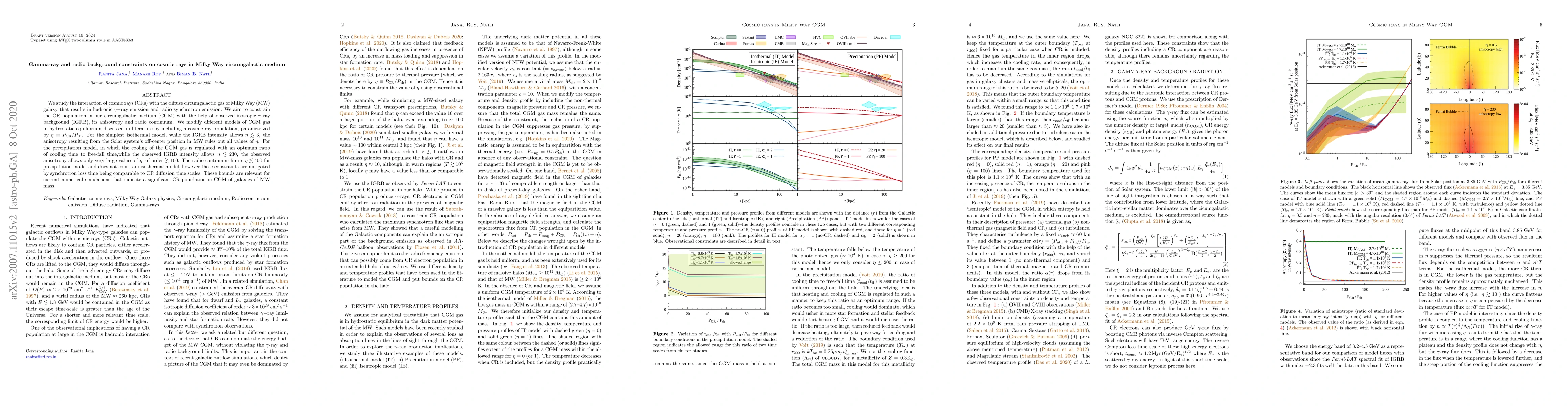 We study the interaction of cosmic rays (CRs) with the diffuse circumgalactic gas of Milky Way (MW) galaxy that results in hadronic $\gamma-$ray emission and radio synchrotron emission. We aim to constrain the CR population in our circumgalactic medium (CGM) with the help of observed isotropic $\gamma$-ray background (IGRB), its anisotropy and radio continuum. We modify different models of CGM gas in hydrostatic equilibrium discussed in literature by including a cosmic ray population, parametrized by $\eta \equiv P_{\rm CR}/P_{\rm th}$. For the simplest isothermal model, while the IGRB intensity allows $\eta \lesssim 3$, the anisotropy resulting from the Solar system's off-center position in MW rules out all values of $\eta$. For the precipitation model, in which the cooling of the CGM gas is regulated with an optimum ratio of cooling time to free-fall time,while the observed IGRB intensity allows $\eta \lesssim 230$, the observed anisotropy allows only very large values of $\eta$, of order $\gtrsim 100$. The radio continuum limits $\eta \lesssim 400$ for precipitation model and does not constrain isothermal model, however these constraints are mitigated by synchrotron loss time being comparable to CR diffusion time scales. These bounds are relevant for current numerical simulations that indicate a significant CR population in CGM of galaxies of MW mass.