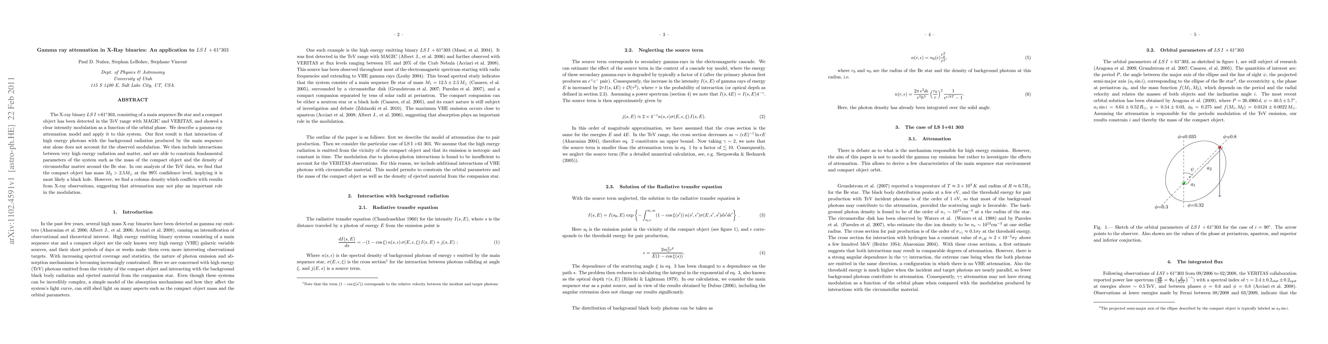 The X-ray binary LSI +61 303, consisting of a main sequence Be star and a compact object has been detected in the TeV range with MAGIC and VERITAS, and showed a clear intensity modulation as a function of the orbital phase. We describe a gamma-ray attenuation model and apply it to this system. Our first result is that interaction of high energy photons with the background radiation produced by the main sequence star alone does not account for the observed modulation. We then include interactions between very high energy radiation and matter, and are able to constrain fundamental parameters of the system such as the mass of the compact object and the density of circumstellar matter around the Be star. In our analysis of the TeV data, we find that the compact object has mass $M_2>2.5M_{\odot}$ at the 99% confidence level, implying it is most likely a black hole. However, we find a column density which conflicts with results from X-ray observations, suggesting that attenuation may not play an important role in the modulation.