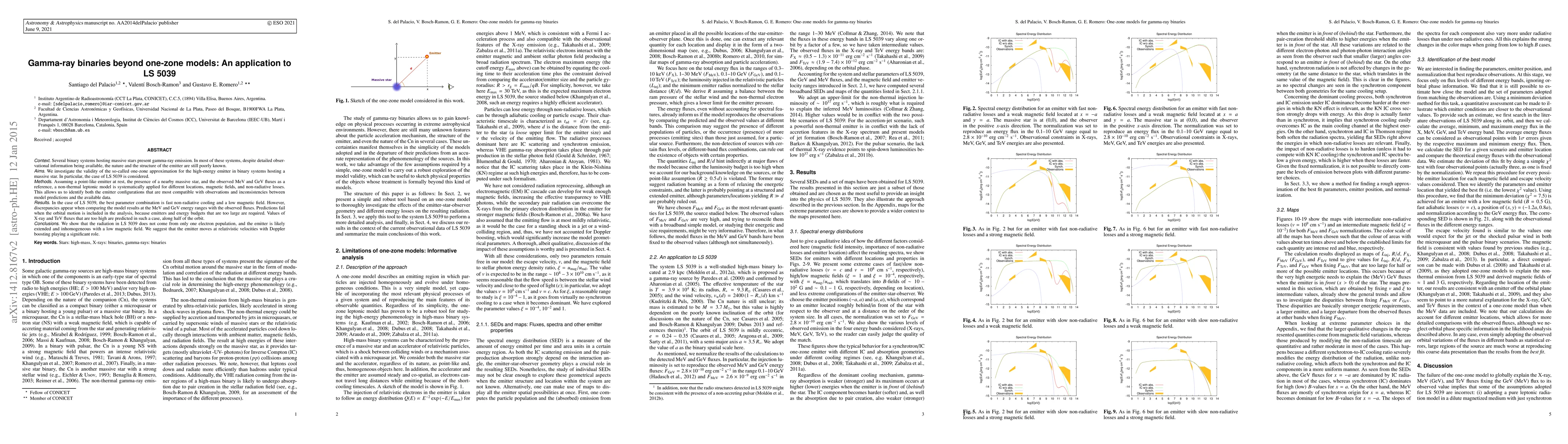 Context: Several binary systems hosting massive stars present gamma-ray emission. In most of these systems, despite detailed observational information being available, the nature and the structure of the emitter are still poorly known. Aims: We investigate the validity of the so-called one-zone approximation for the high-energy emitter in binary systems hosting a massive star. In particular, the case of LS 5039 is considered. Methods: Assuming a point-like emitter at rest, the presence of a nearby massive star, and the observed MeV and GeV fluxes as a reference, a non-thermal leptonic model is systematically applied for different locations, magnetic fields, and non-radiative losses. This allows us to identify both the emitter configurations that are most compatible with observations and inconsistencies between model predictions and the available data. Results: In the case of LS 5039, the best parameter combination is fast non-radiative cooling and a low magnetic field. However, discrepancies appear when comparing the model results at the MeV and GeV energy ranges with the observed fluxes. Predictions fail when the orbital motion is included in the analysis, because emitters and energy budgets that are too large are required. Values of X-ray and TeV fluxes that are too high are predicted in such a case, along half of the orbit. Conclusions: We show that the radiation in LS 5039 does not come from only one electron population, and the emitter is likely extended and inhomogeneous with a low magnetic field. We suggest that the emitter moves at relativistic velocities with Doppler boosting playing a significant role. Key words. Stars: high-mass, X-rays: binaries, gamma-rays: binaries