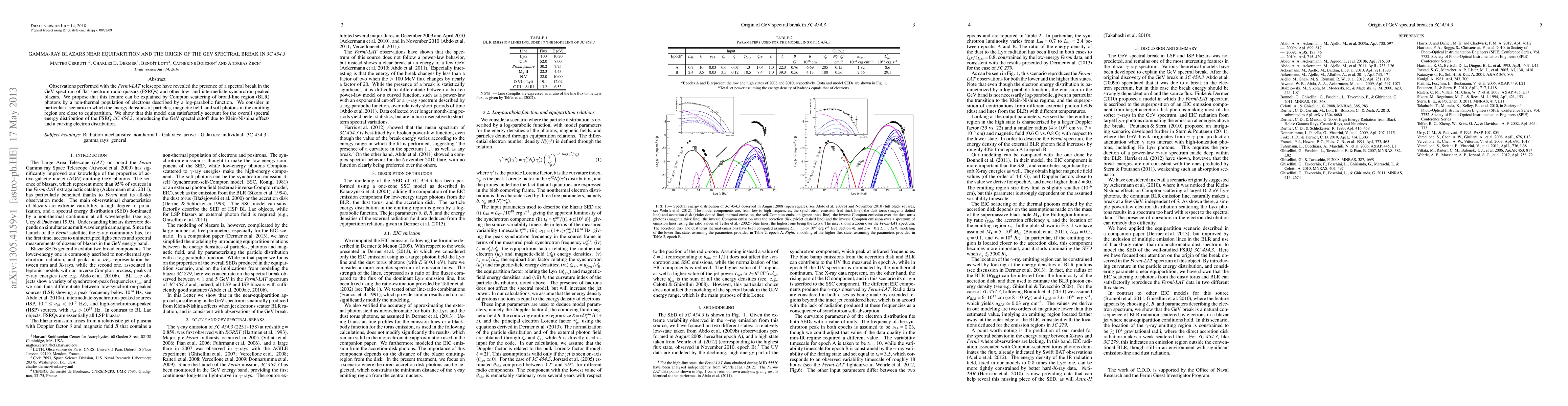 This paper proposes that the GeV spectral break in blazars like 3C 454.3 is due to Compton scattering of BLR photons by a log-parabolic electron population, with equipartition between energy densities of particles, magnetic fields, and soft photons. The model successfully explains the observed spectral energy distribution and the GeV cutoff.