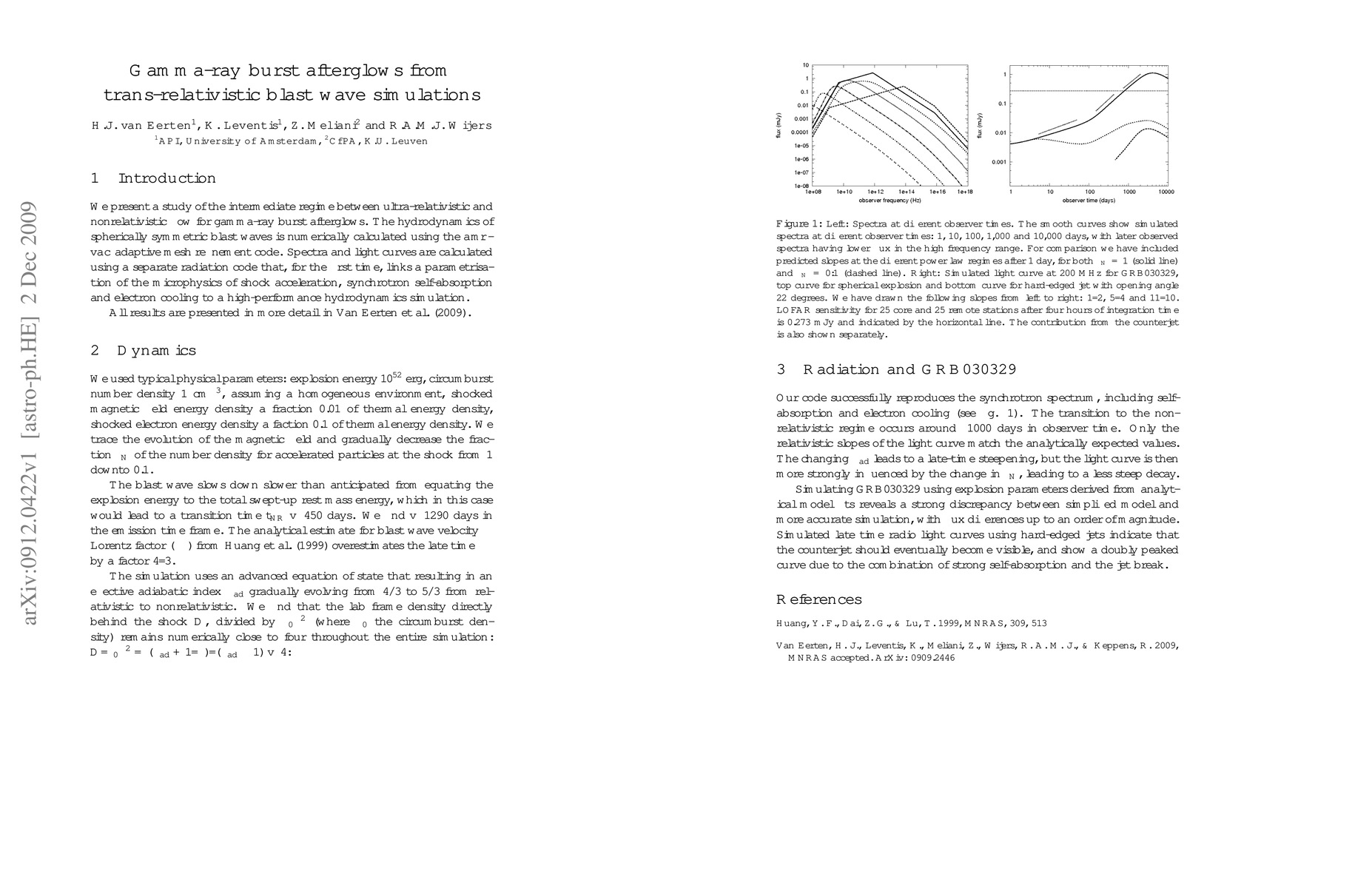 We present a study of the intermediate regime between ultra-relativistic and nonrelativistic flow for gamma-ray burst afterglows. The hydrodynamics of spherically symmetric blast waves is numerically calculated using the AMRVAC adaptive mesh refinement code. Spectra and light curves are calculated using a separate radiation code that, for the first time, links a parametrisation of the microphysics of shock acceleration, synchrotron self-absorption and electron cooling to a high-performance hydrodynamics simulation.