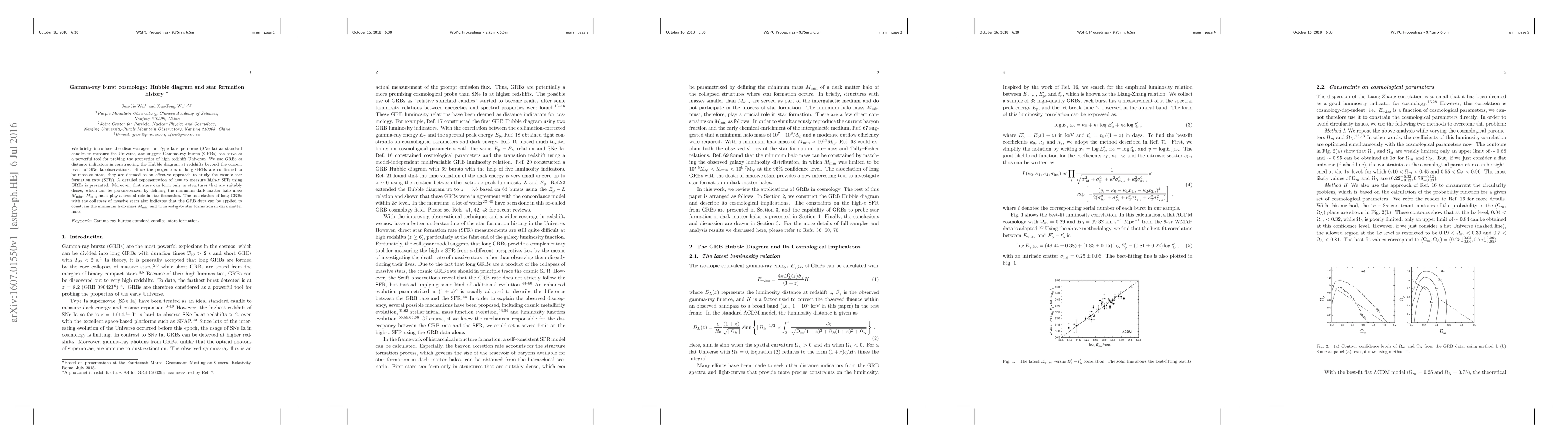 This paper explores the use of Gamma-ray bursts (GRBs) as distance indicators to construct a Hubble diagram at high redshifts, surpassing the reach of Type Ia supernovae. It also investigates the correlation between long GRBs and massive stars to study cosmic star formation rates and to constrain the minimum dark matter halo mass necessary for star formation.