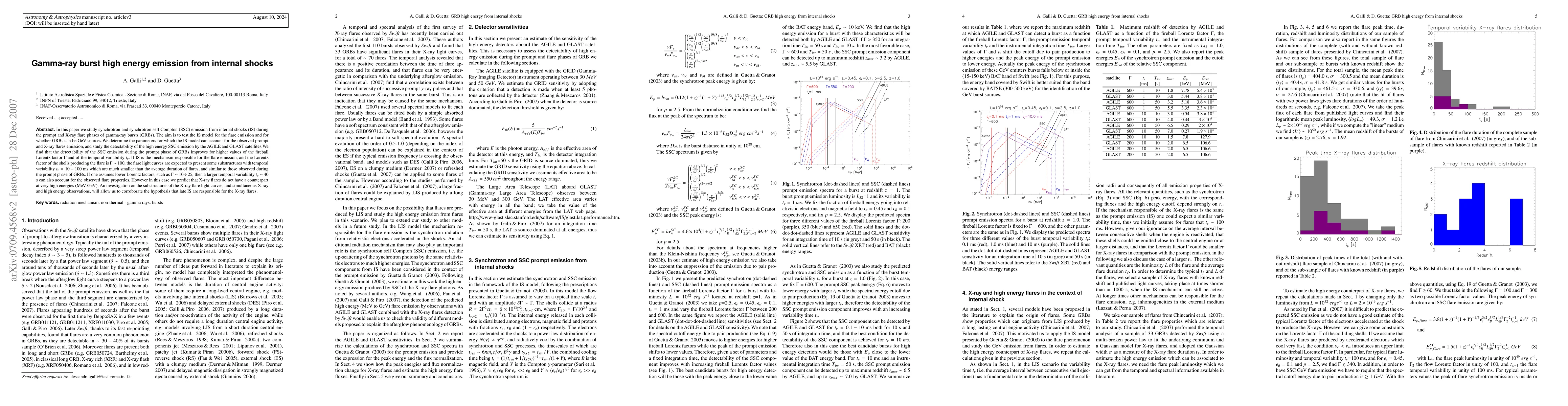 This paper investigates synchrotron and SSC emission from internal shocks in Gamma-Ray Bursts (GRBs), testing the IS model for flare emission and GRBs' potential as GeV sources. It finds that higher Lorentz factors and temporal variability improve SSC detectability, suggesting substructures in flare light curves if Lorentz factors are around 100.