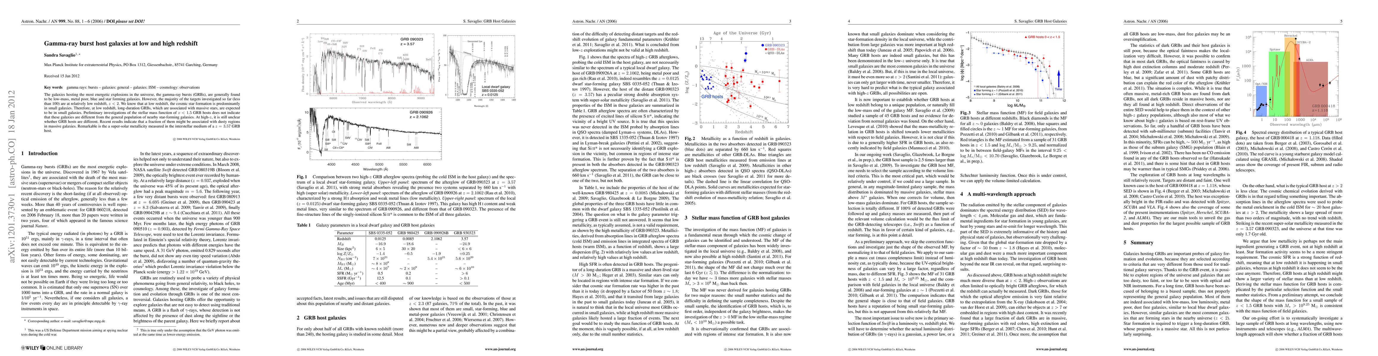 This paper explores the characteristics of galaxies hosting gamma-ray bursts (GRBs) at both low and high redshifts, noting that GRB hosts are typically low-mass, metal-poor, and star-forming, with preliminary evidence suggesting no significant difference from nearby star-forming galaxies at low redshifts. At high redshifts, some GRB hosts may be linked to dusty regions in massive galaxies, with one notable case showing super-solar metallicity.