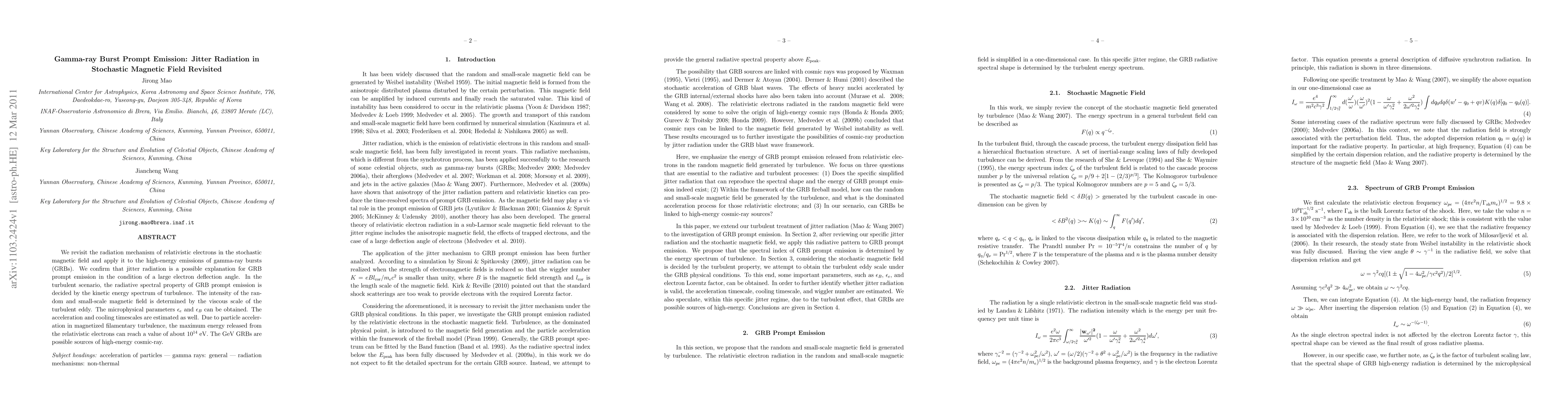 The paper revisits the jitter radiation mechanism of relativistic electrons in stochastic magnetic fields, applying it to gamma-ray bursts (GRBs) prompt emissions.