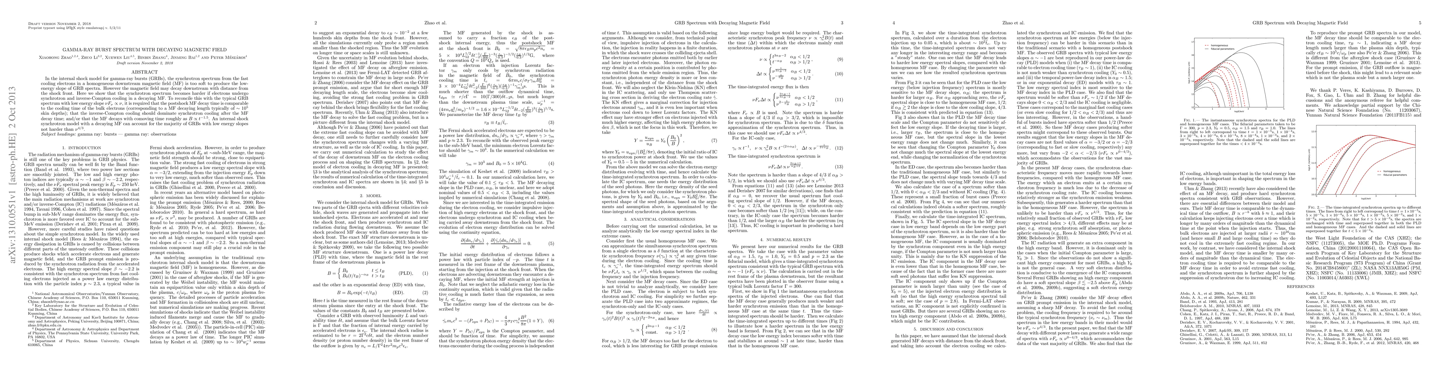 This paper proposes that a decaying magnetic field downstream from a gamma-ray burst shock front can produce a harder synchrotron spectrum, resolving the issue of too soft spectra in the internal shock model. The model suggests that the magnetic field decay time must match the cooling time of electrons to match observed low-energy slopes.