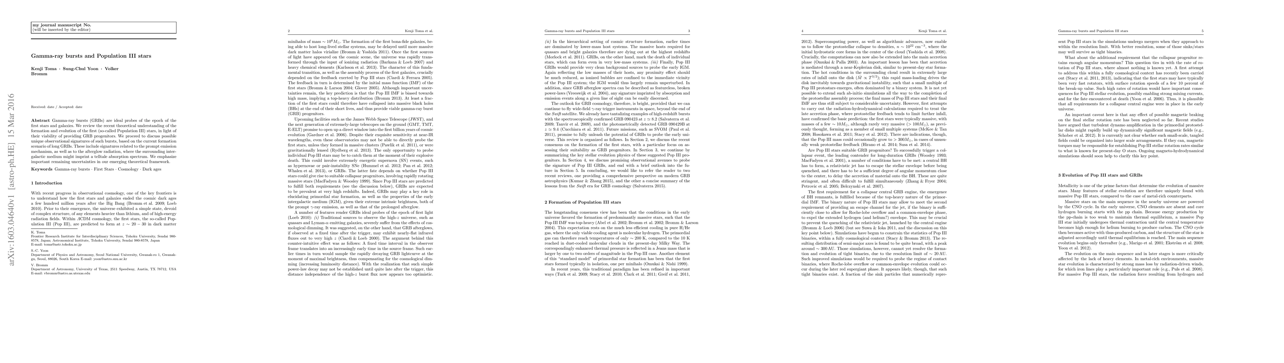 This paper reviews the theoretical basis for Population III stars as potential progenitors of gamma-ray bursts (GRBs), discussing unique observational signatures of such bursts, including prompt emission and afterglow radiation. It highlights uncertainties in the current understanding of GRB formation and the evolution of the first stars.