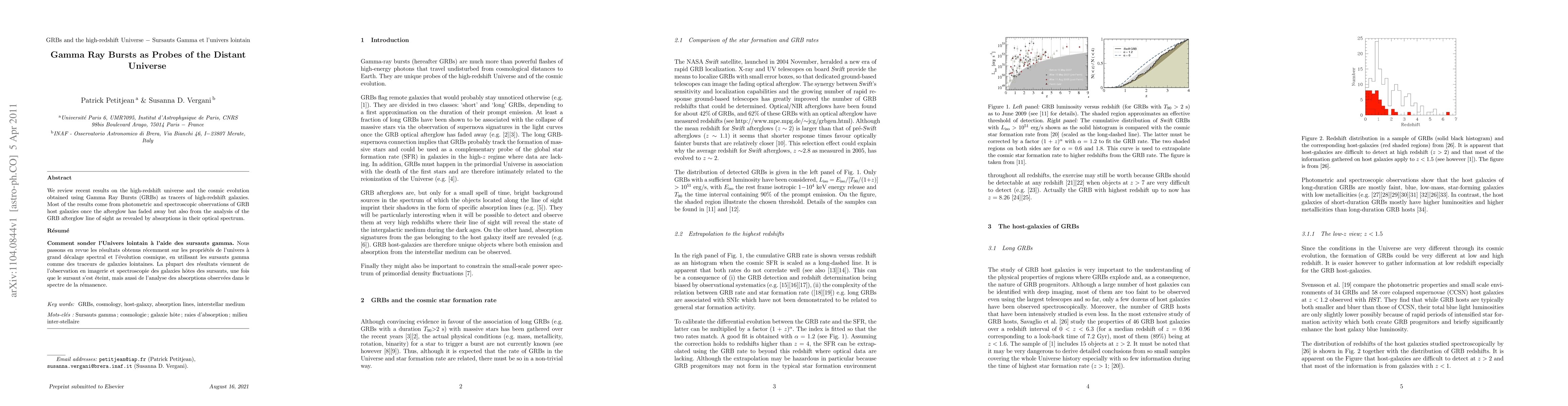 We review recent results on the high-redshift universe and the cosmic evolution obtained using Gamma Ray Bursts (GRBs) as tracers of high-redshift galaxies. Most of the results come from photometric and spectroscopic observations of GRB host galaxies once the afterglow has faded away but also from the analysis of the GRB afterglow line of sight as revealed by absorptions in their optical spectrum.
