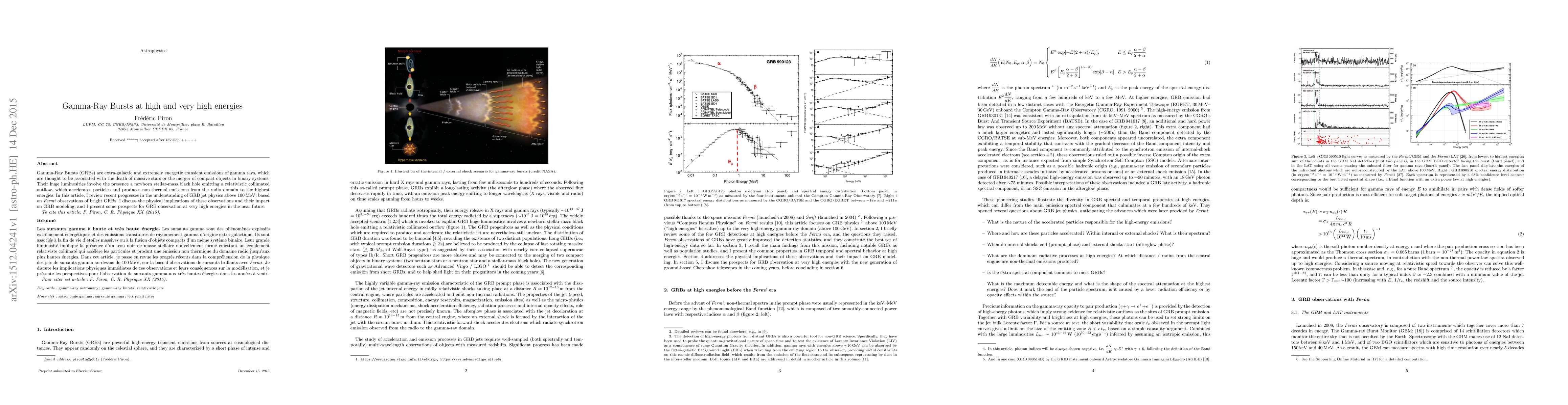 Gamma-Ray Bursts (GRBs) are extra-galactic and extremely energetic transient emissions of gamma rays, which are thought to be associated with the death of massive stars or the merger of compact objects in binary systems. Their huge luminosities involve the presence a newborn stellar-mass black hole emitting a relativistic collimated outflow, which accelerates particles and produces non-thermal emissions from the radio domain to the highest energies. In this article, I review recent progresses in the understanding of GRB jet physics above 100 MeV, based on Fermi observations of bright GRBs. I discuss the physical implications of these observations and their impact on GRB modeling, and I present some prospects for GRB observation at very high energies in the near future.