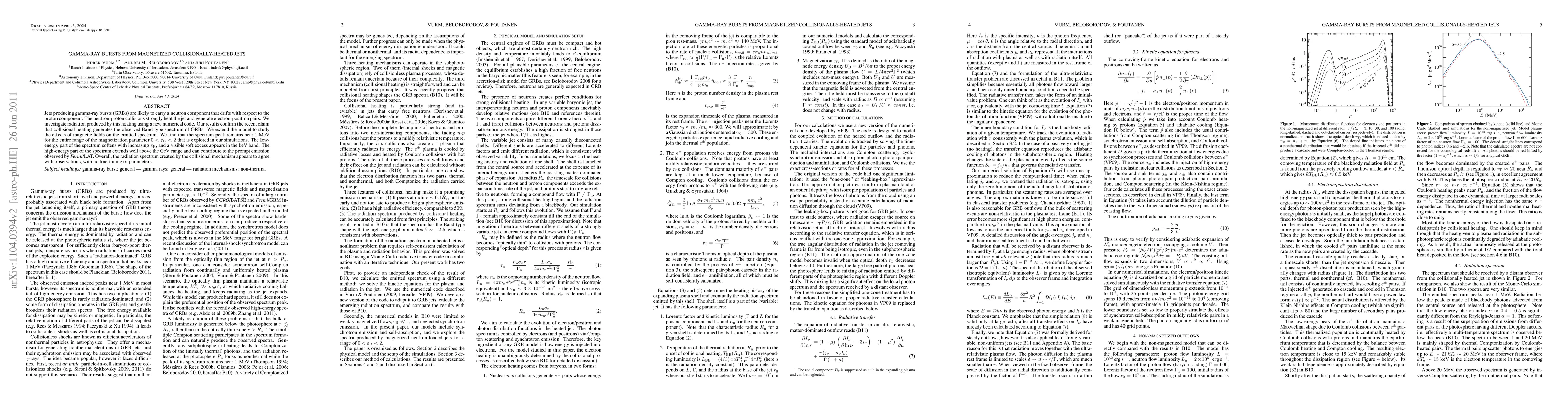 Jets producing gamma-ray bursts (GRBs) are likely to carry a neutron component that drifts with respect to the proton component. The neutron-proton collisions strongly heat the jet and generate electron-positron pairs. We investigate radiation produced by this heating using a new numerical code. Our results confirm the recent claim that collisional heating generates the observed Band-type spectrum of GRBs. We extend the model to study the effects of magnetic fields on the emitted spectrum. We find that the spectrum peak remains near 1 MeV for the entire range of the magnetization parameter $0<\epsilon_B<2$ that is explored in our simulations. The low-energy part of the spectrum softens with increasing $\epsilon_B$, and a visible soft excess appears in the keV band. The high-energy part of the spectrum extends well above the GeV range and can contribute to the prompt emission observed by Fermi/LAT. Overall, the radiation spectrum created by the collisional mechanism appears to agree with observations, with no fine-tuning of parameters.