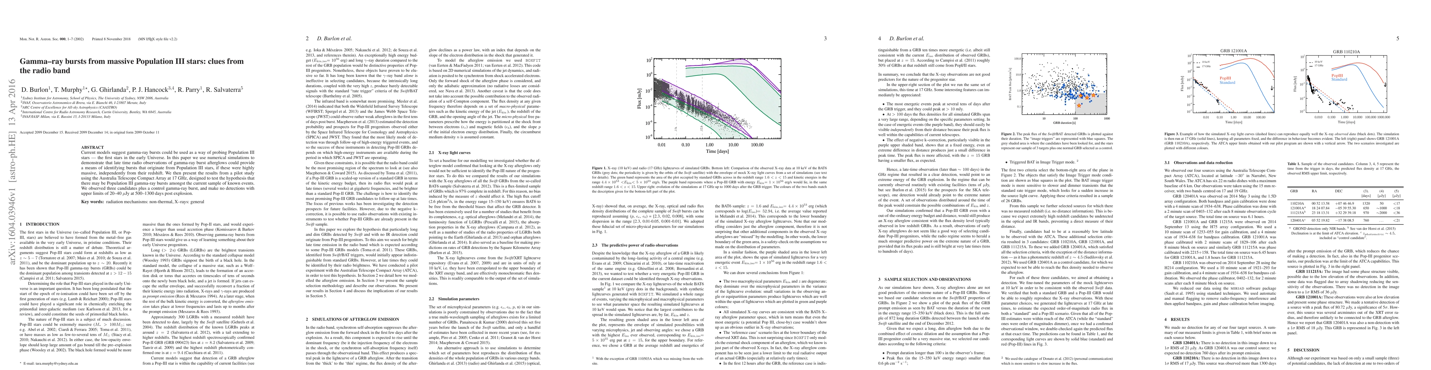 This paper uses numerical simulations to show that late-time radio observations of gamma-ray burst afterglows can identify bursts from massive Population III stars, independent of redshift. The study conducted with the Australia Telescope Compact Array found no evidence of such bursts among three candidates, setting upper limits for radio emissions.