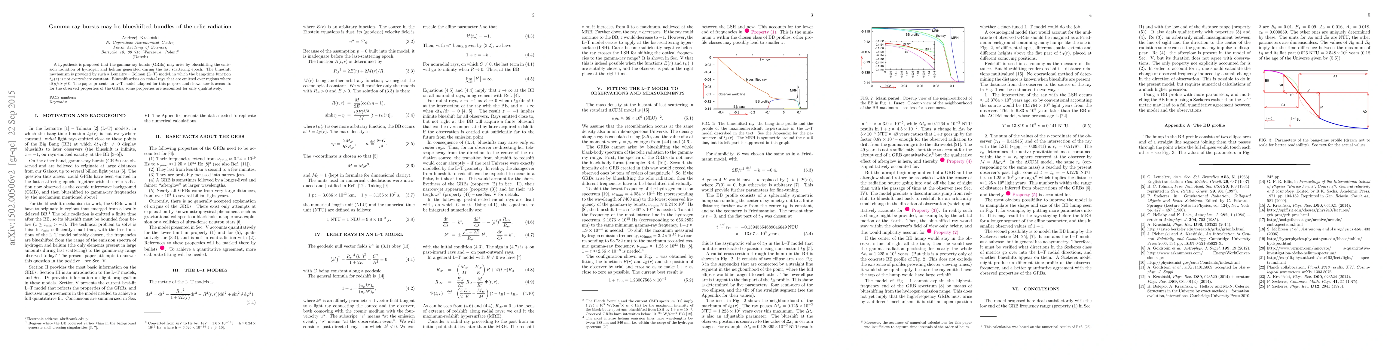 A hypothesis is proposed that the gamma-ray bursts (GRBs) may arise by blueshifting the emission radiation of hydrogen and helium generated during the last scattering epoch. The blueshift mechanism is provided by such a Lema\^itre -- Tolman (L--T) model, in which the bang-time function $t_B(r)$ is not everywhere constant. Blueshift arises on \textit{radial} rays that are emitted over regions where $\dril{t_B} r \neq 0$. The paper presents an L--T model adapted for this purpose and shows how it accounts for the observed properties of the GRBs, some properties are accounted for only qualitatively.