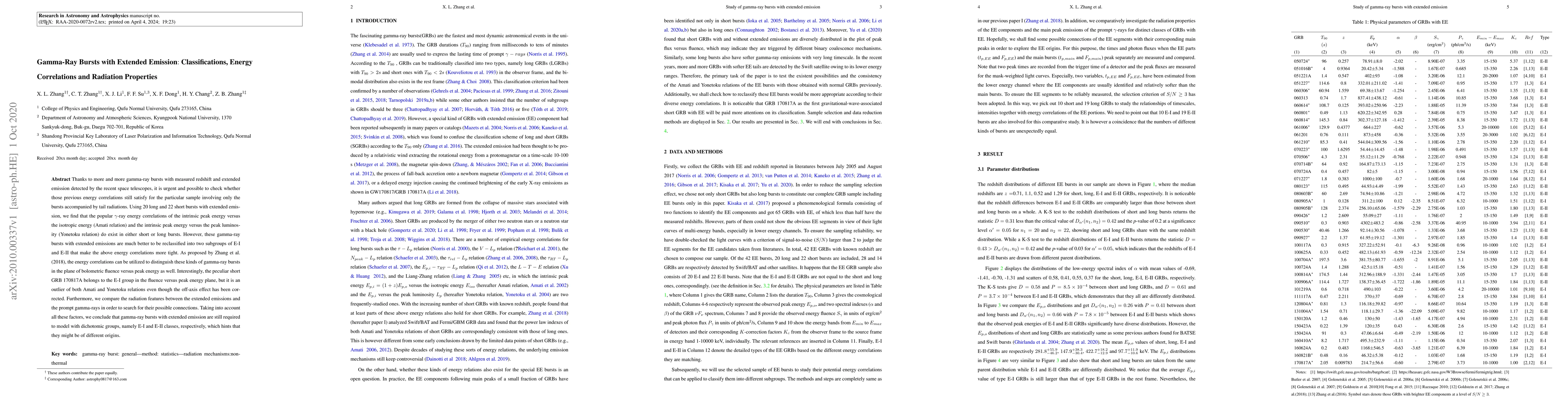This paper examines gamma-ray bursts (GRBs) with extended emission, finding that the Amati and Yonetoku energy correlations hold for both long and short bursts. It proposes reclassification into E-I and E-II subgroups for tighter correlations, suggesting different origins for these groups.