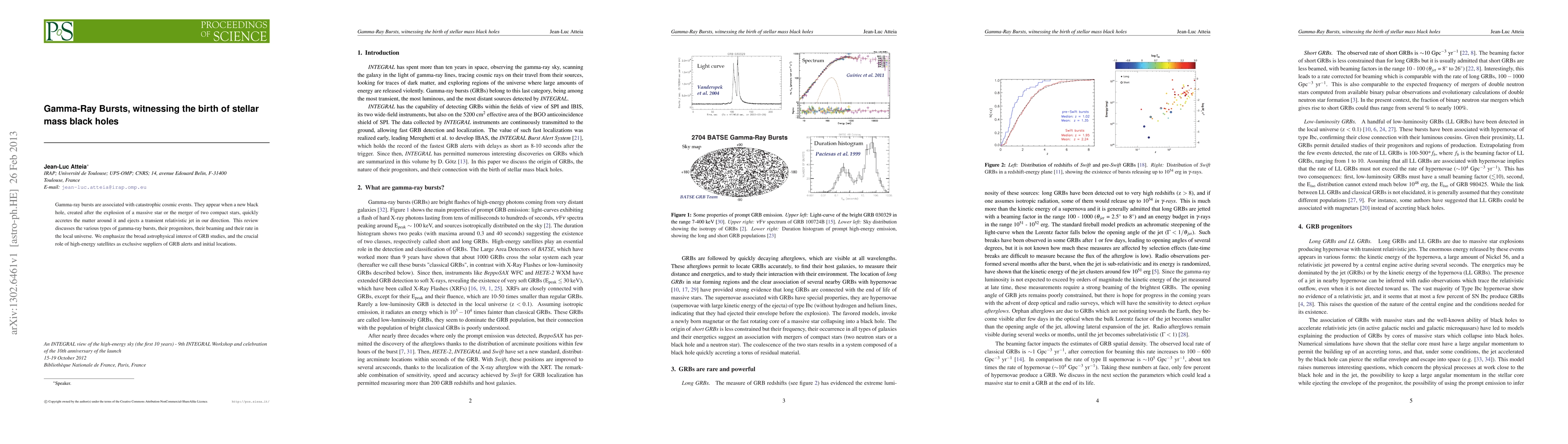 This paper reviews gamma-ray bursts (GRBs), linking them to the formation of stellar mass black holes from massive star explosions or compact star mergers. It highlights the importance of high-energy satellites in detecting and localizing these transient cosmic events.