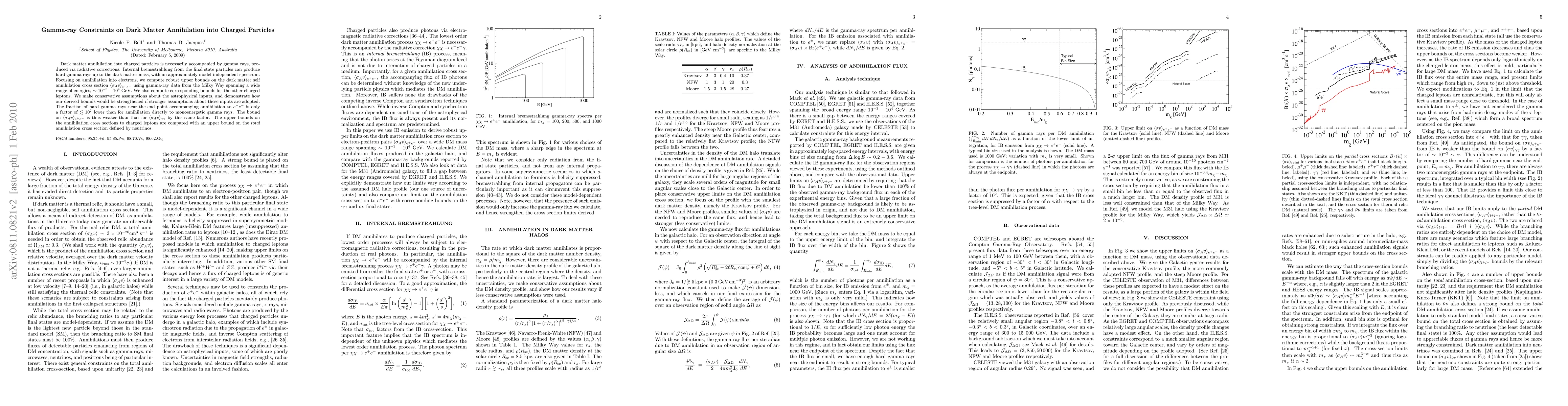 This paper derives upper bounds on the dark matter self-annihilation cross section into charged particles, specifically electrons, using gamma-ray data from the Milky Way. The study finds that the bounds on annihilation into electrons are weaker than those for monoenergetic gamma rays by a factor of $\alt 10^2$, and compares these with bounds on the total annihilation cross section defined by neutrinos.