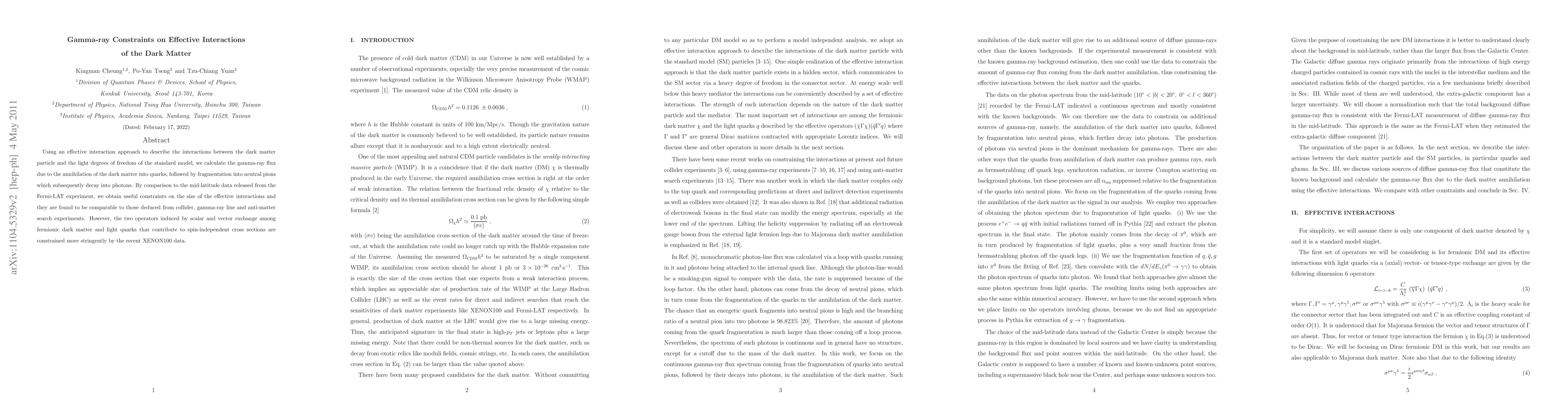 Using an effective interaction approach to describe the interactions between the dark matter particle and the light degrees of freedom of the standard model, we calculate the gamma-ray flux due to the annihilation of the dark matter into quarks, followed by fragmentation into neutral pions which subsequently decay into photons. By comparison to the mid-latitude data released from the Fermi-LAT experiment, we obtain useful constraints on the size of the effective interactions and they are found to be comparable to those deduced from collider, gamma-ray line and anti-matter search experiments. However, the two operators induced by scalar and vector exchange among fermionic dark matter and light quarks that contribute to spin-independent cross sections are constrained more stringently by the recent XENON100 data.