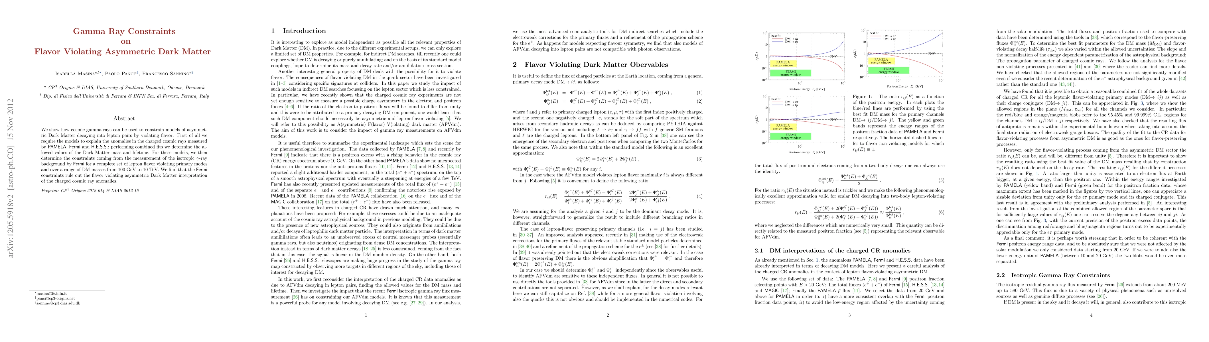 We show how cosmic gamma rays can be used to constrain models of asymmetric Dark Matter decaying into lepton pairs by violating flavor. First of all we require the models to explain the anomalies in the charged cosmic rays measured by PAMELA, FERMI and HESS; performing combined fits we determine the allowed values of the Dark Matter mass and lifetime. For these models, we then determine the constraints coming from the measurement of the isotropic gamma-ray background by FERMI for a complete set of lepton flavor violating primary modes and over a range of DM masses from 100 GeV to 10 TeV. We find that the FERMI constraints rule out the flavor violating asymmetric Dark Matter interpretation of the charged cosmic ray anomalies.
