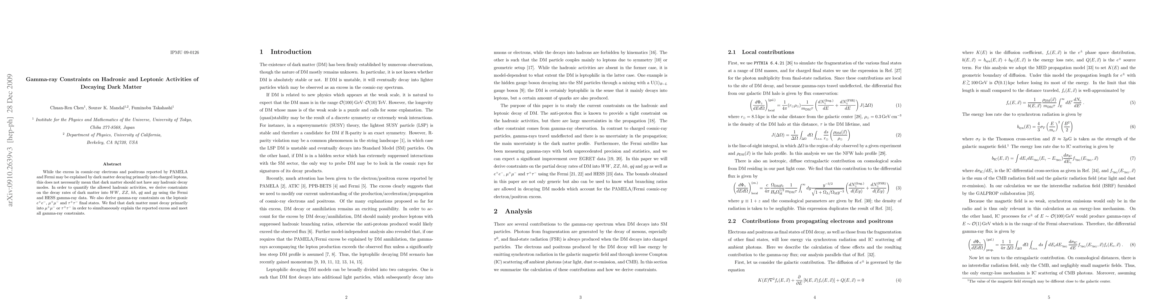 This paper derives gamma-ray constraints on the decay activities of dark matter, focusing on both hadronic and leptonic channels, using Fermi and HESS data. It concludes that dark matter must predominantly decay into muon or tau pairs to account for observed cosmic-ray excesses while satisfying all gamma-ray constraints.