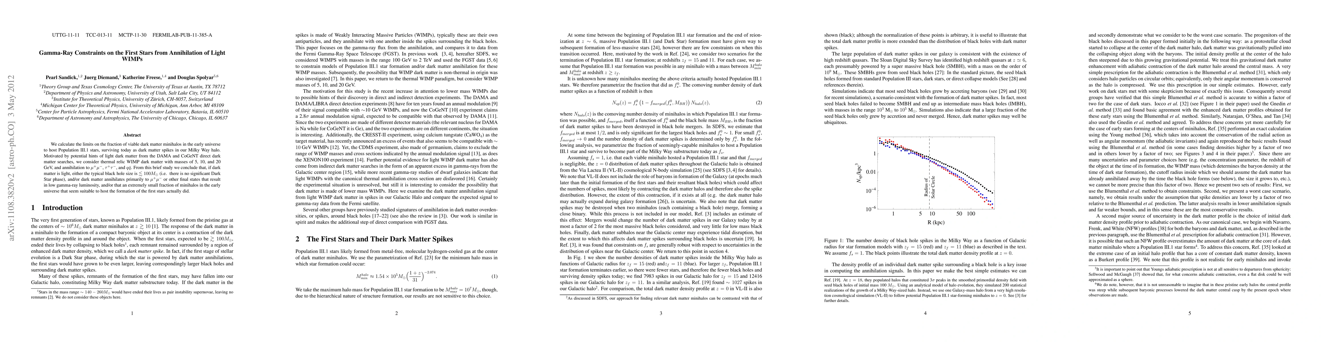 We calculate the limits on the fraction of viable dark matter minihalos in the early universe to host Population III.1 stars, surviving today as dark matter spikes in our Milky Way halo. Motivated by potential hints of light dark matter from the DAMA and CoGeNT direct dark matter searches, we consider thermal relic WIMP dark matter with masses of 5, 10, and 20 GeV, and annihilation to mu^+ mu^-, tau^+ tau^-, and q bar{q}. From this brief study we conclude that, if dark matter is light, either the typical black hole size is \lesssim 100 M_\odot (i.e. there is no significant Dark Star phase), and/or dark matter annihilates primarily to mu^+ mu^- or other final states that result in low gamma-ray luminosity, and/or that an extremely small fraction of minihalos in the early universe that seem suitable to host the formation of the first stars actually did.